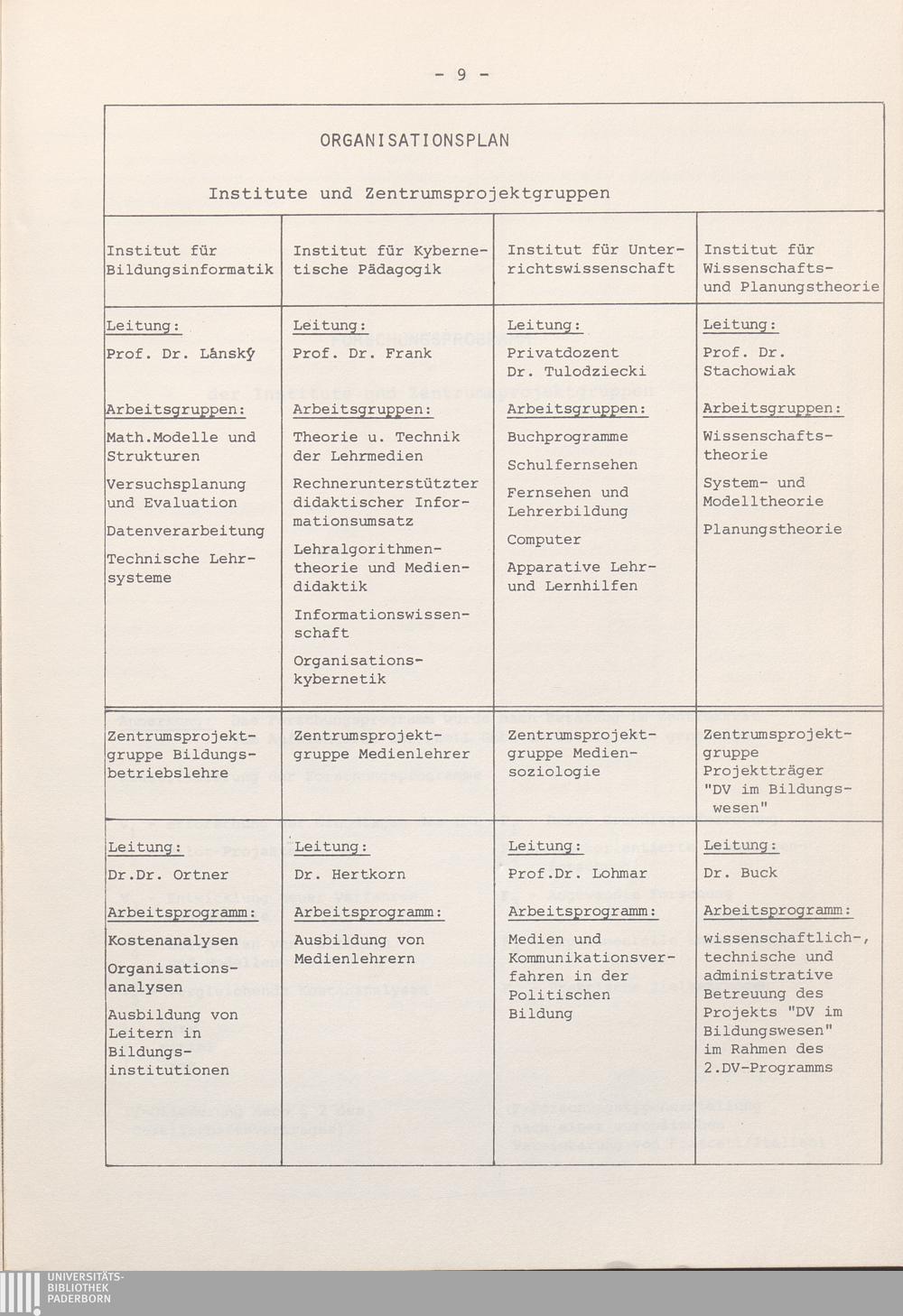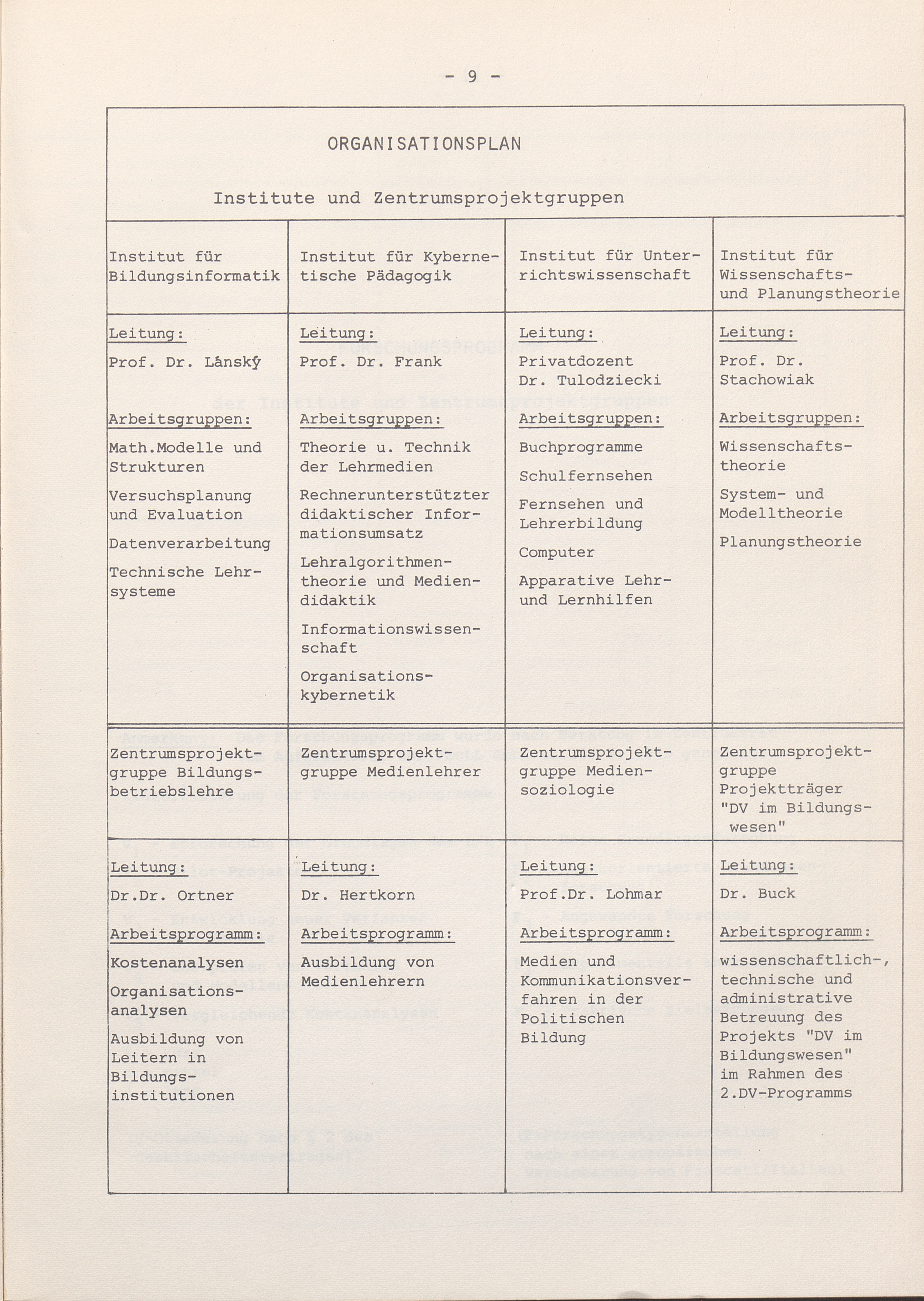 Organisationsplan und Forschungsprogramm der Institute und Zentrumsprojektgruppen