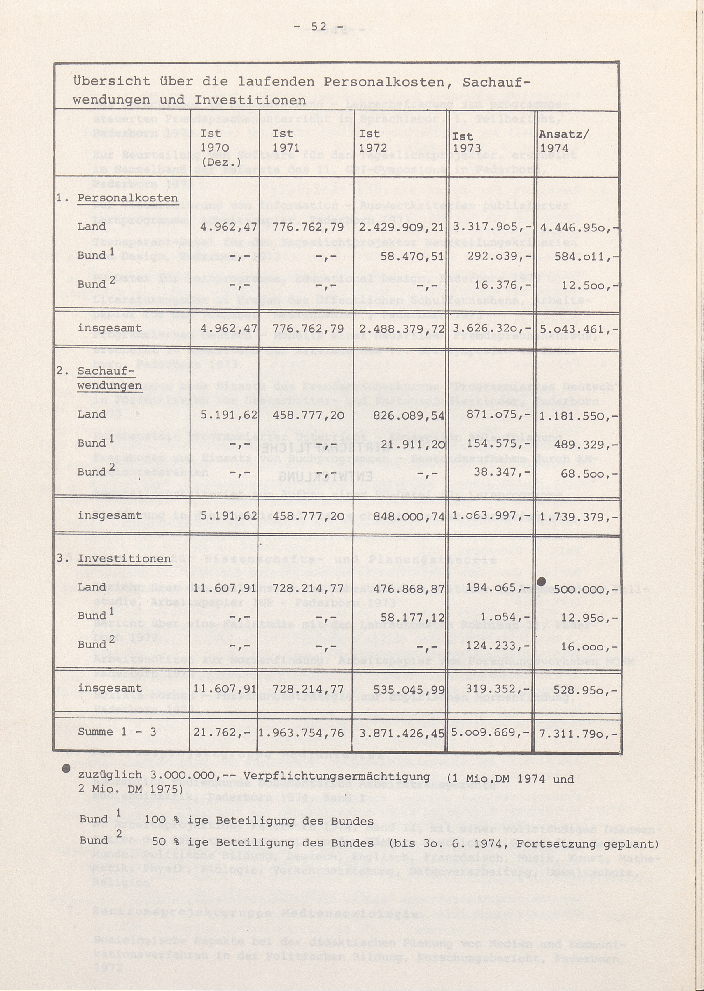 Übersicht über die laufenden Personalkosten, Sachaufwendungen und Investitionen