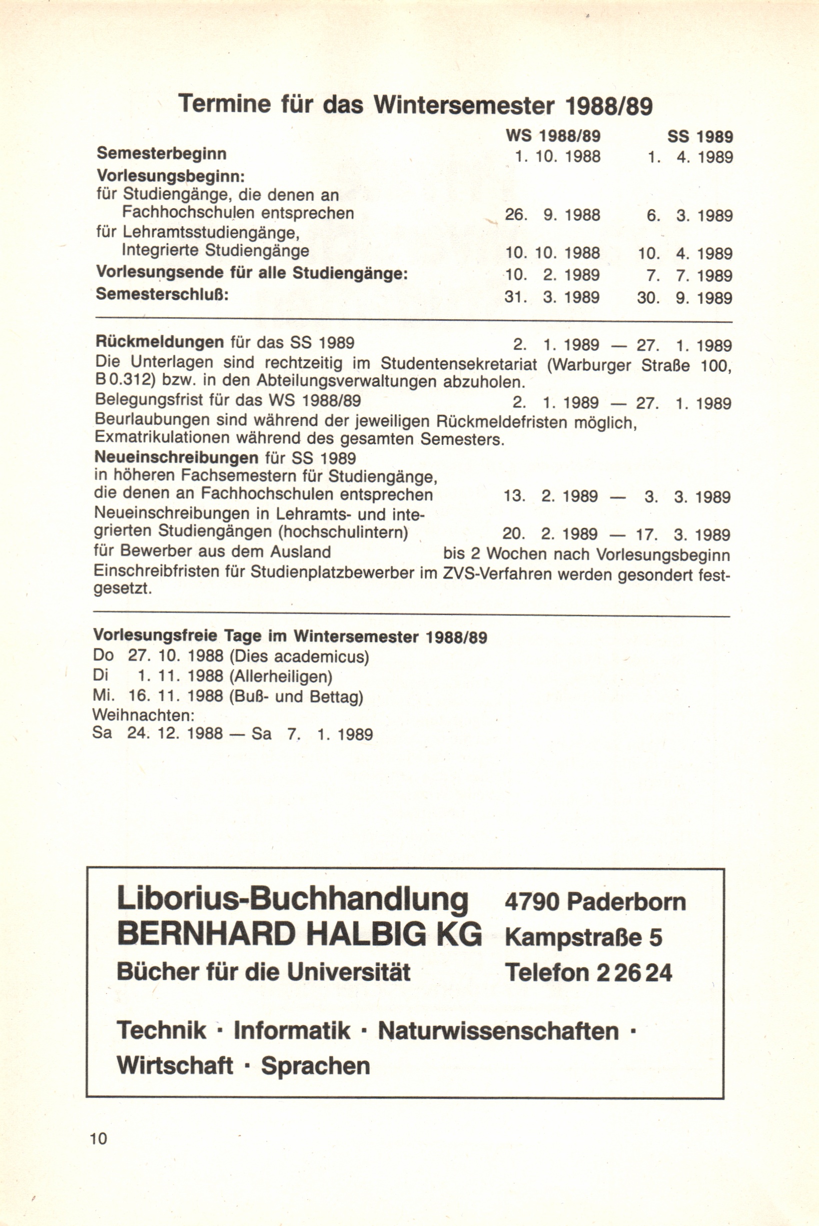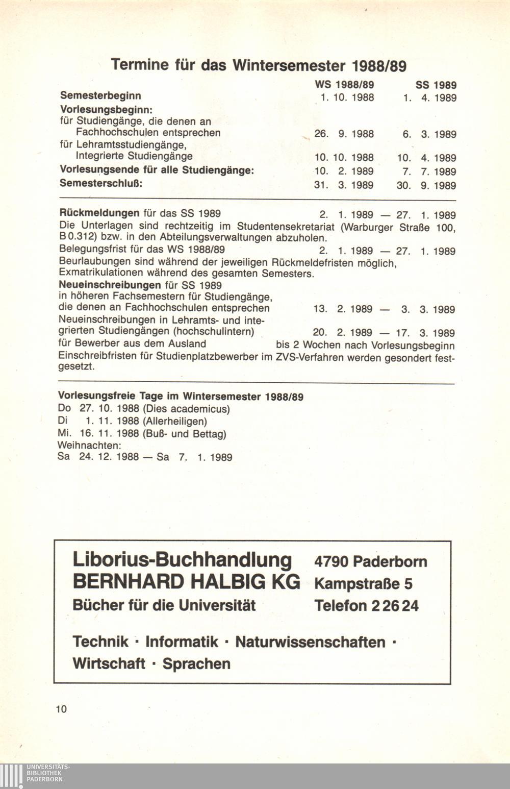 Termine für das Wintersemester 1988/89