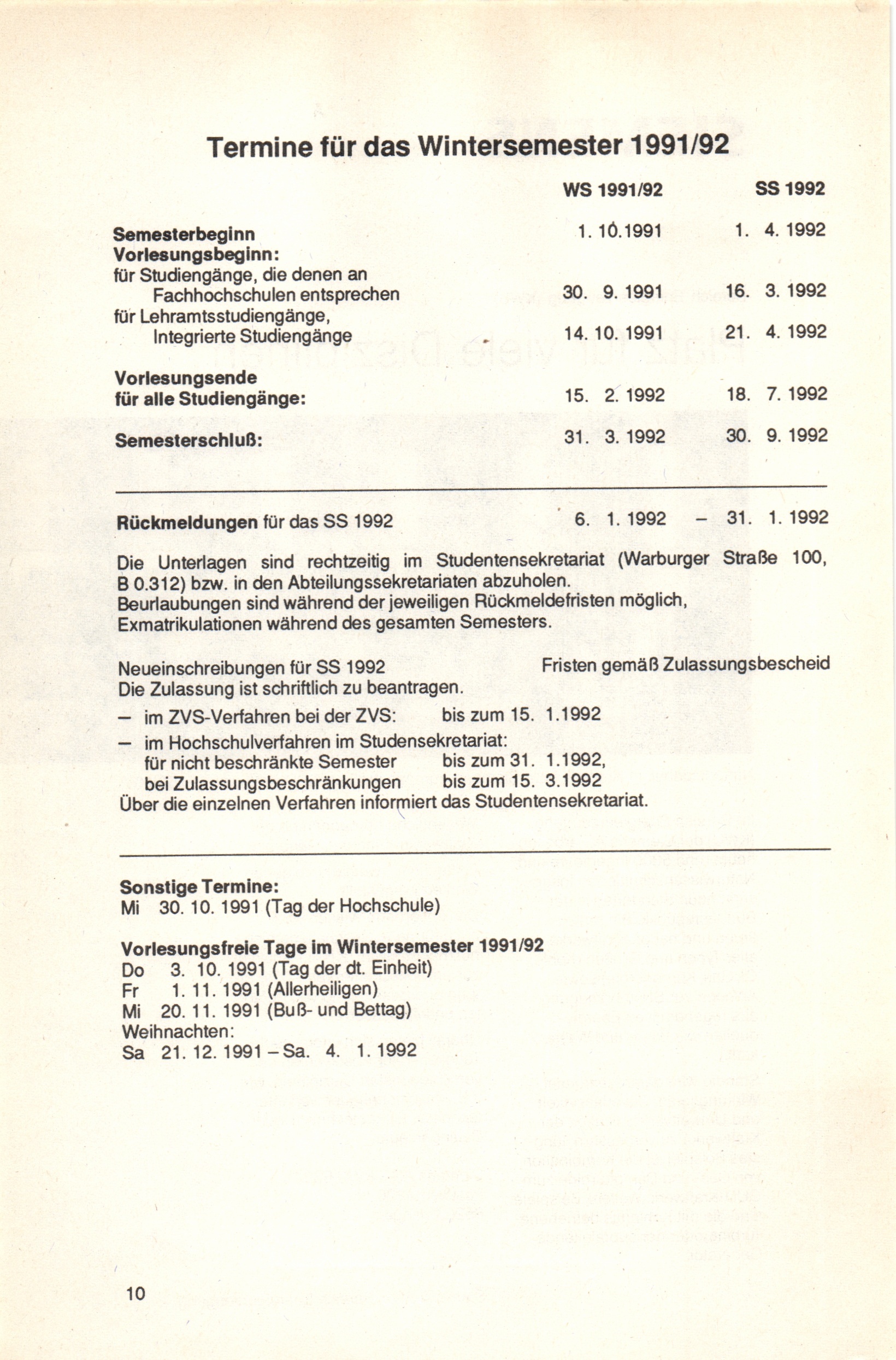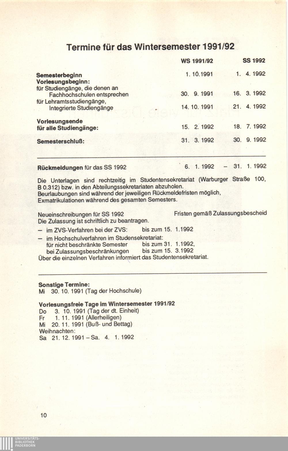 Termine für das Wintersemester 1991/92