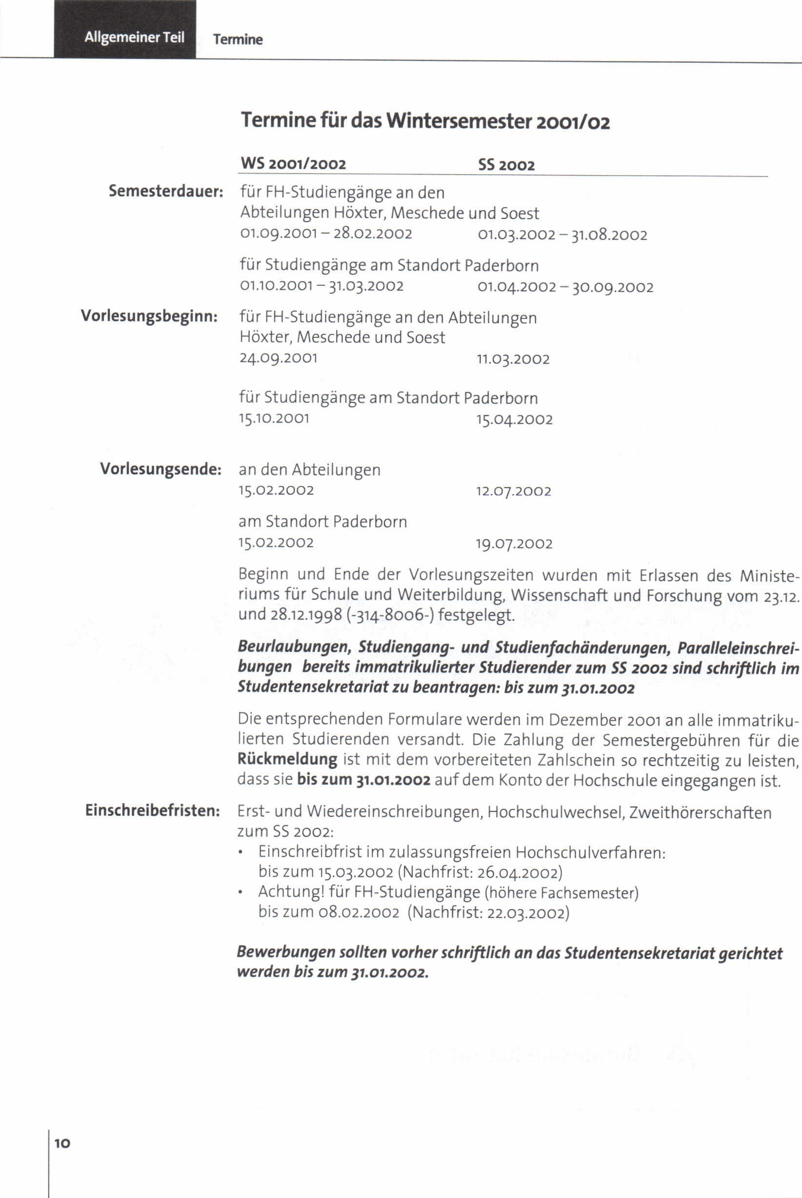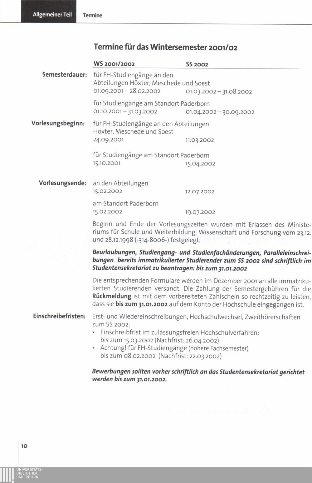Termine für das Wintersemester 2001/02