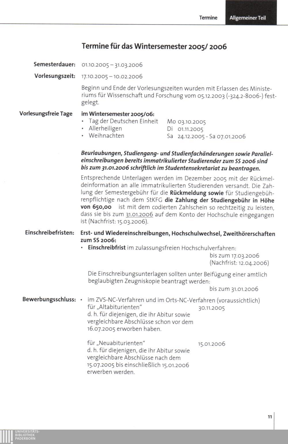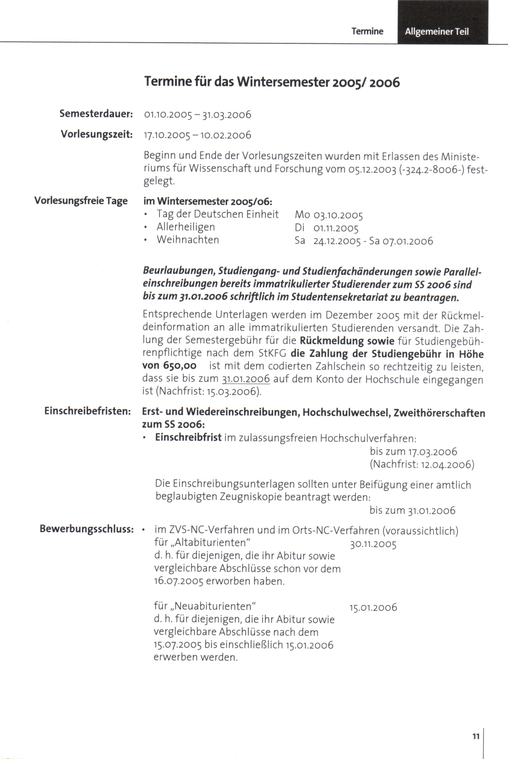 Termine für das Wintersemester 2005/06