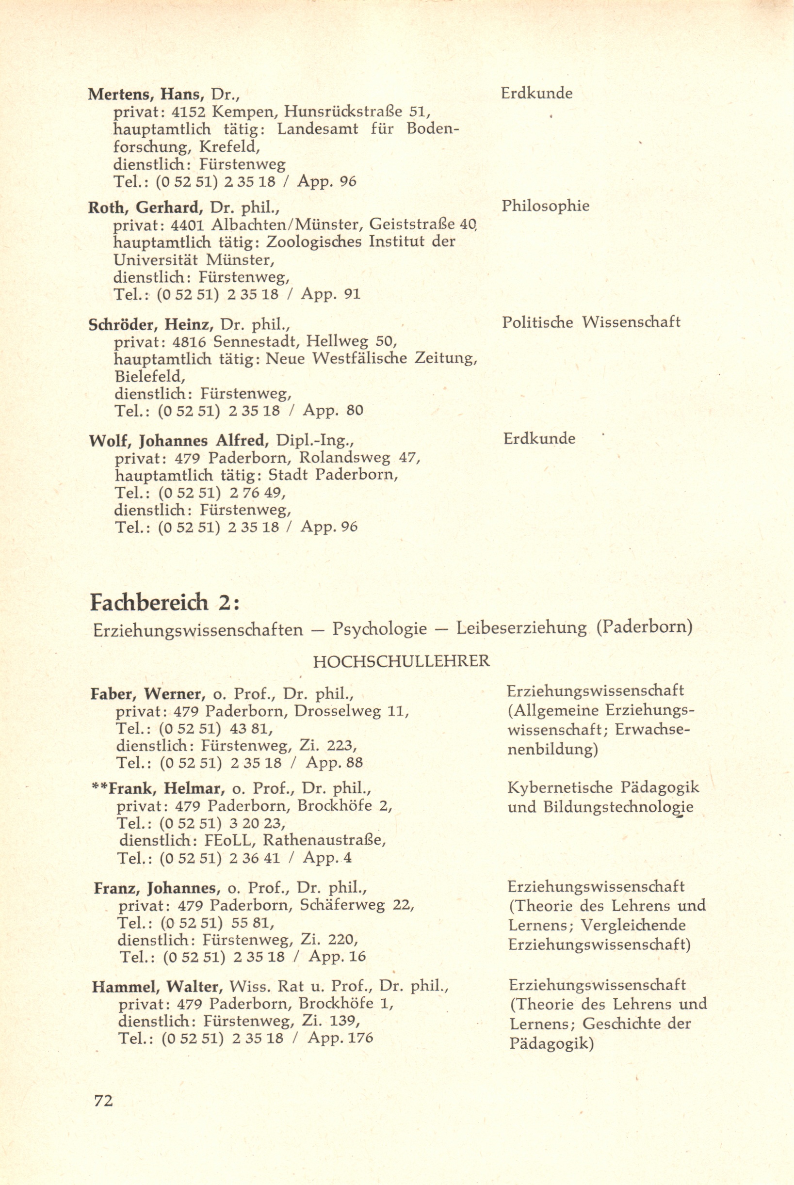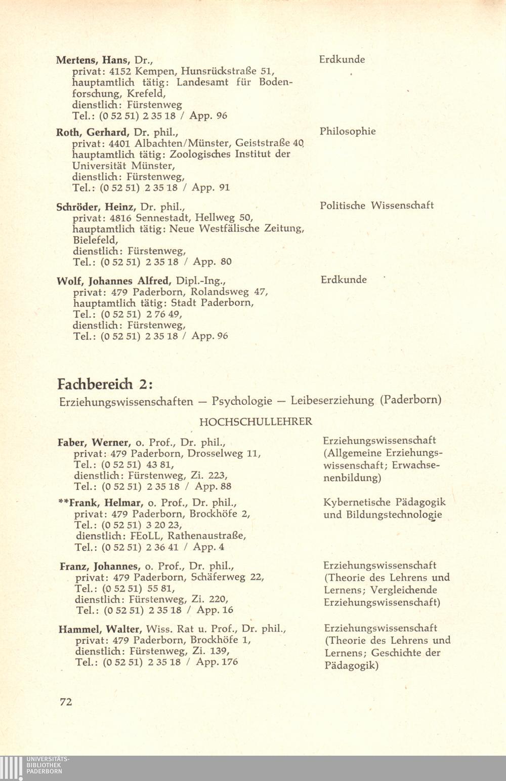 Fachbereich 2: Erziehungswissenschaften - Psychologie - Leibeserziehung (Paderbo[...]