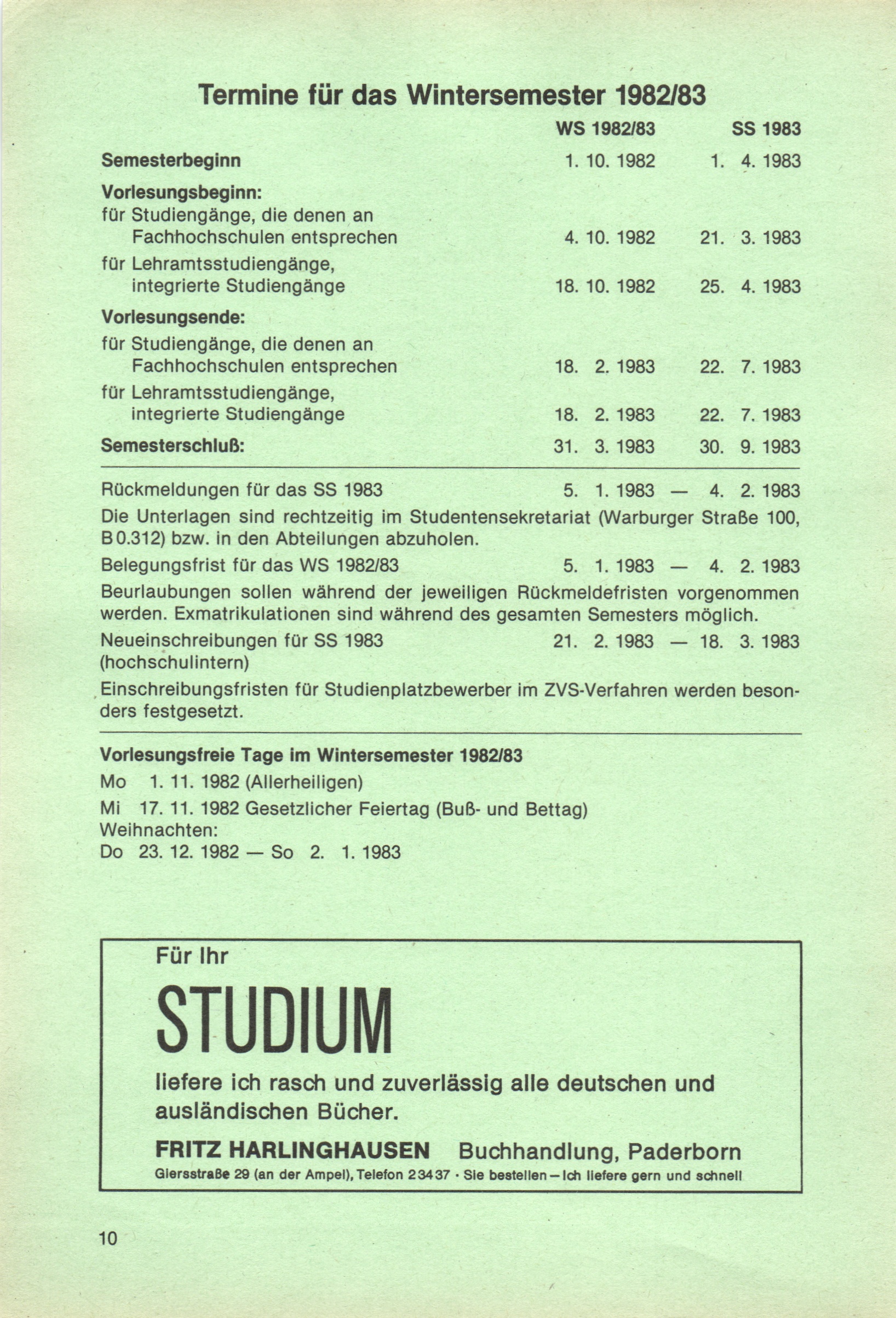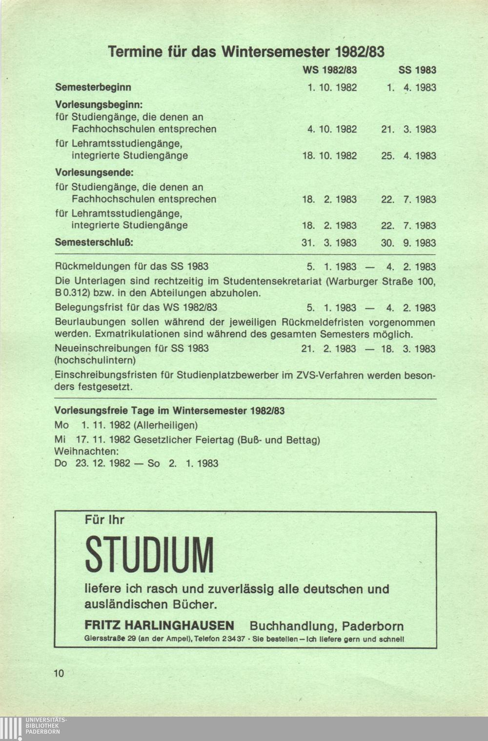 Termine für das Wintersemester 1982/83