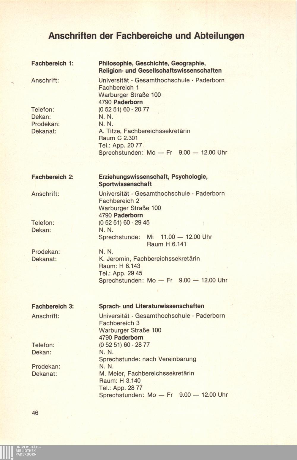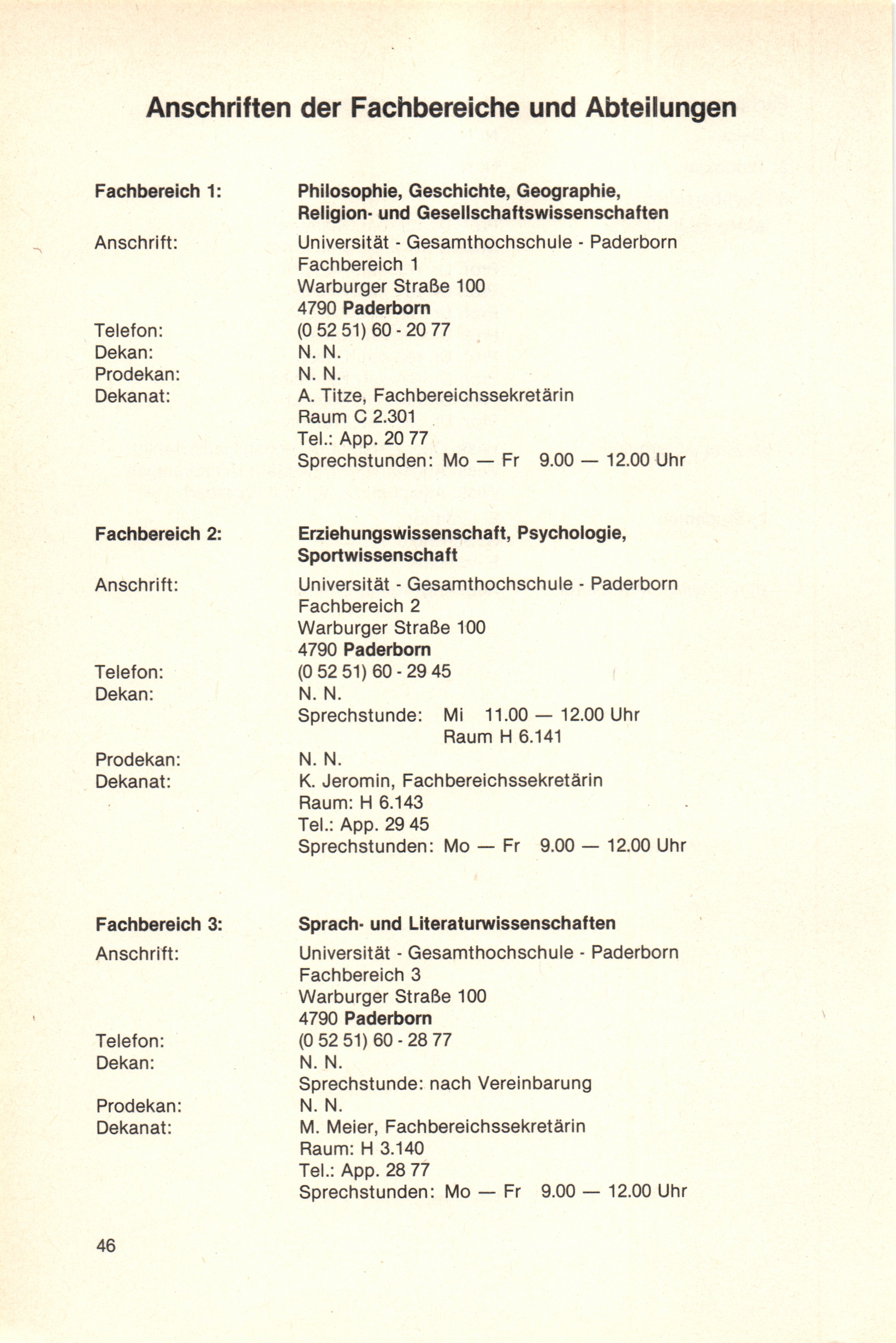 Anschriften der Fachbereiche und Abteilungen