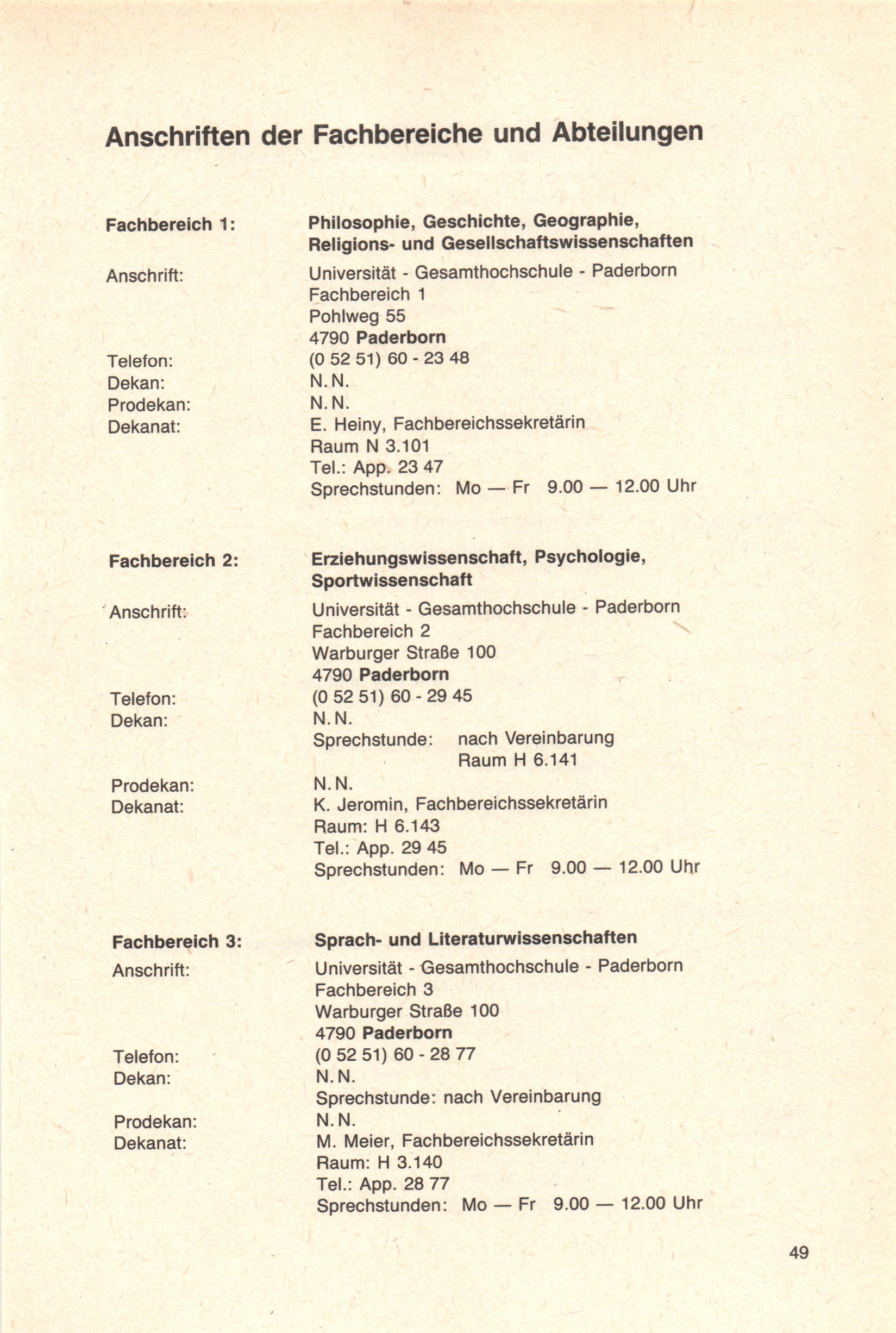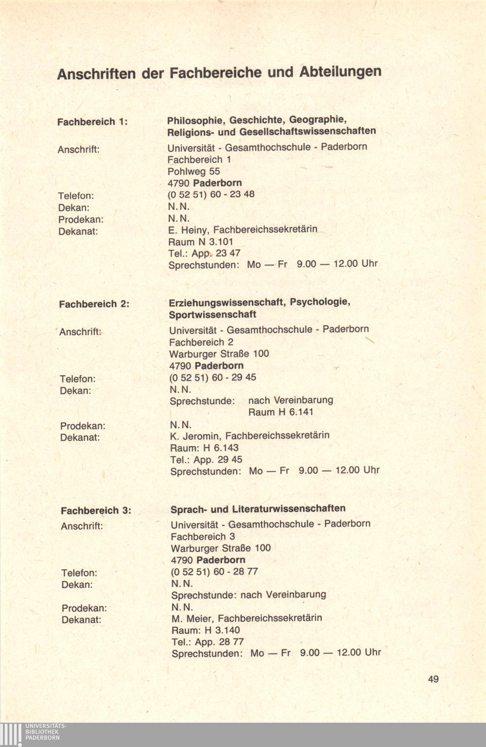 Anschriften der Fachbereiche und Abteilungen