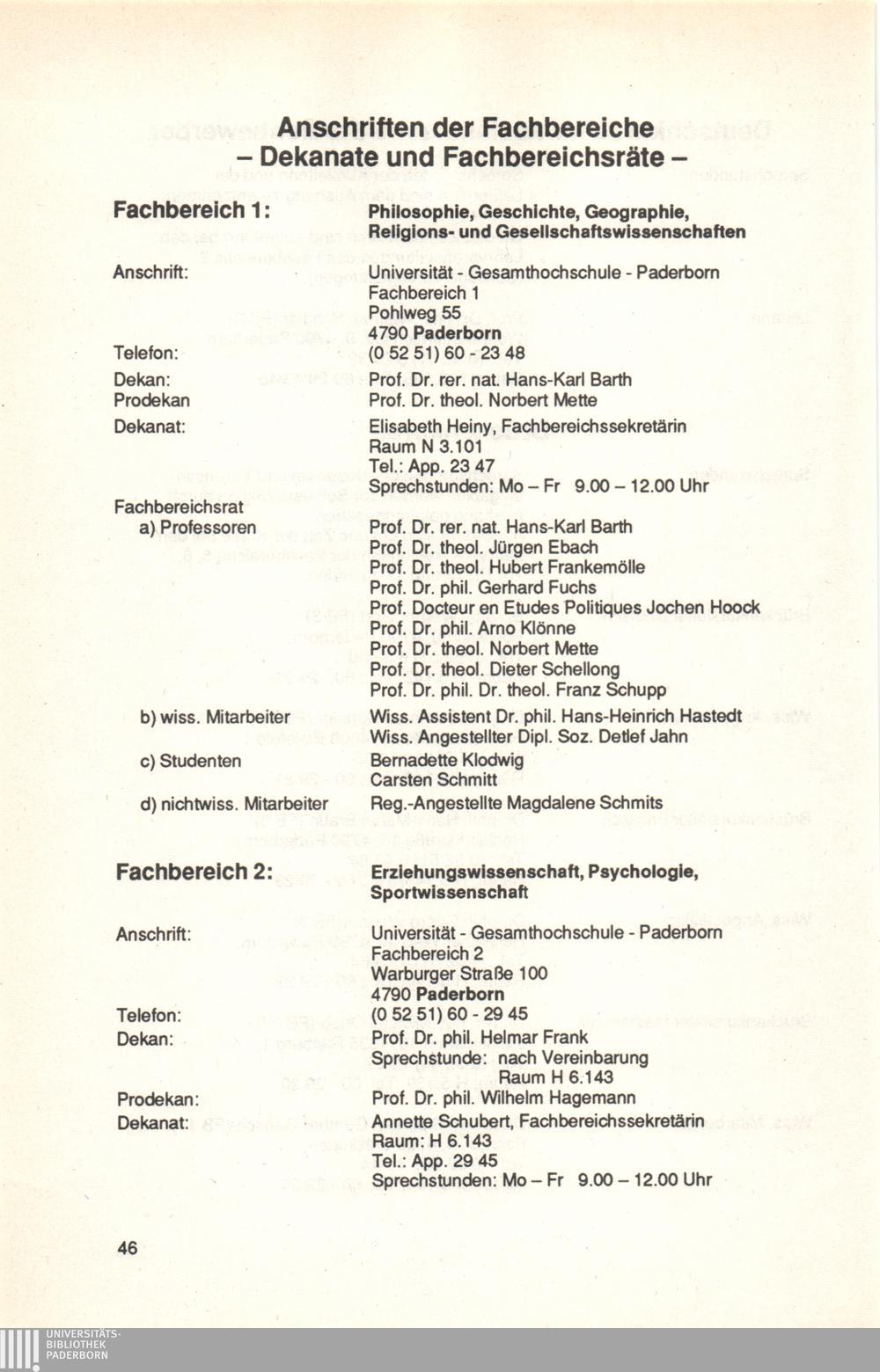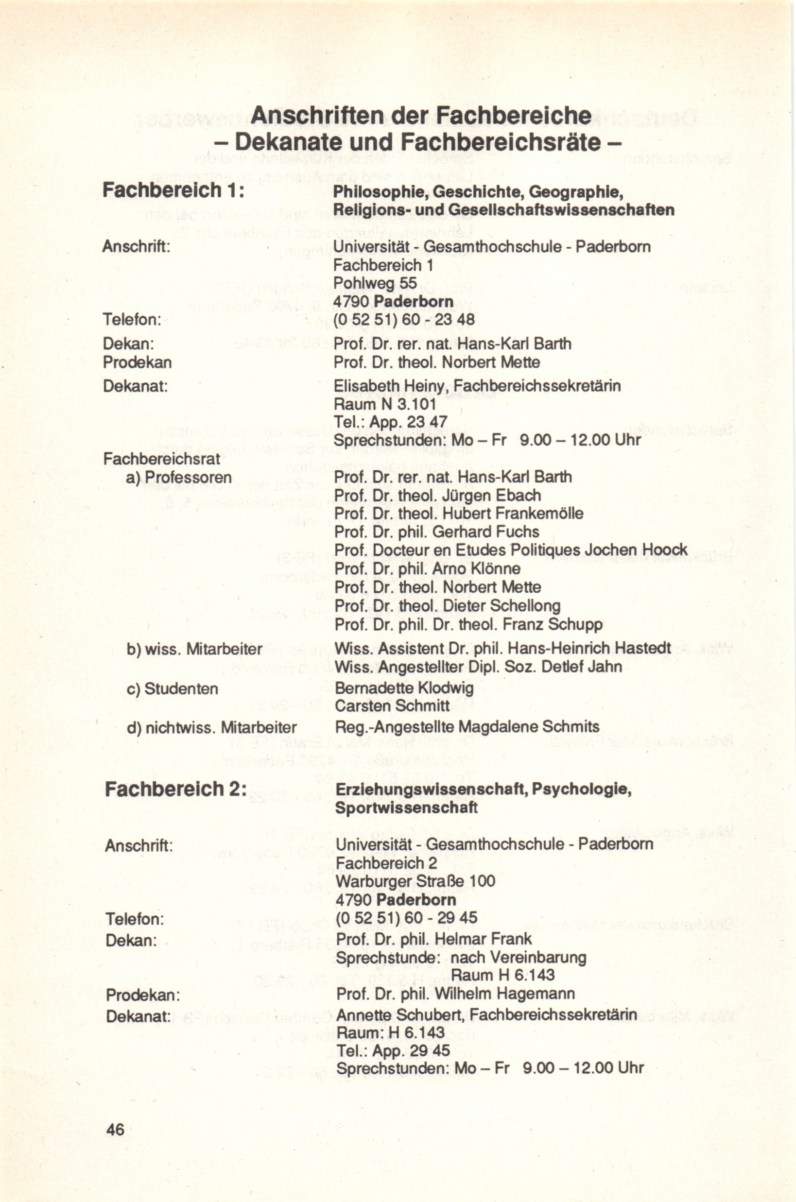 Anschriften der Fachbereiche - Dekanate und Fachbereichsräte