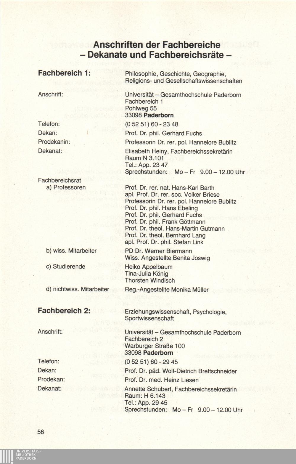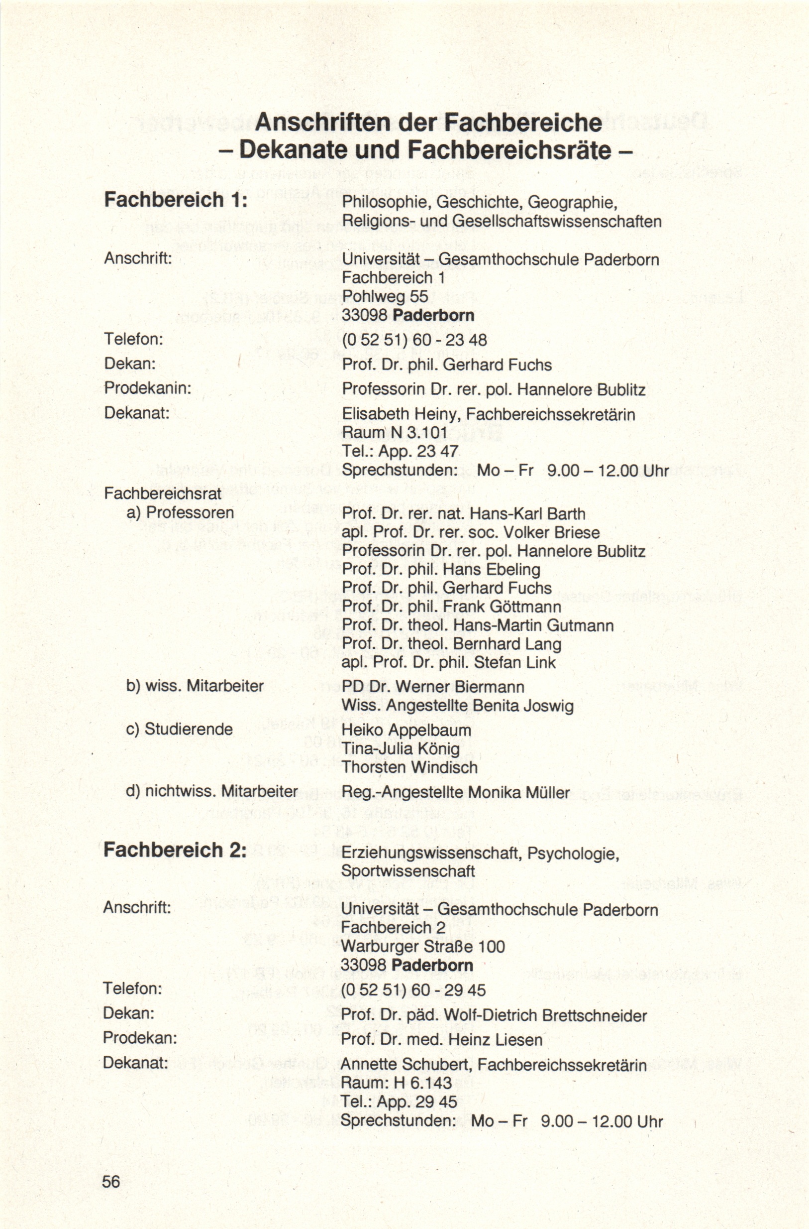 Anschriften der Fachbereiche - Dekanate und Fachbereichsräte