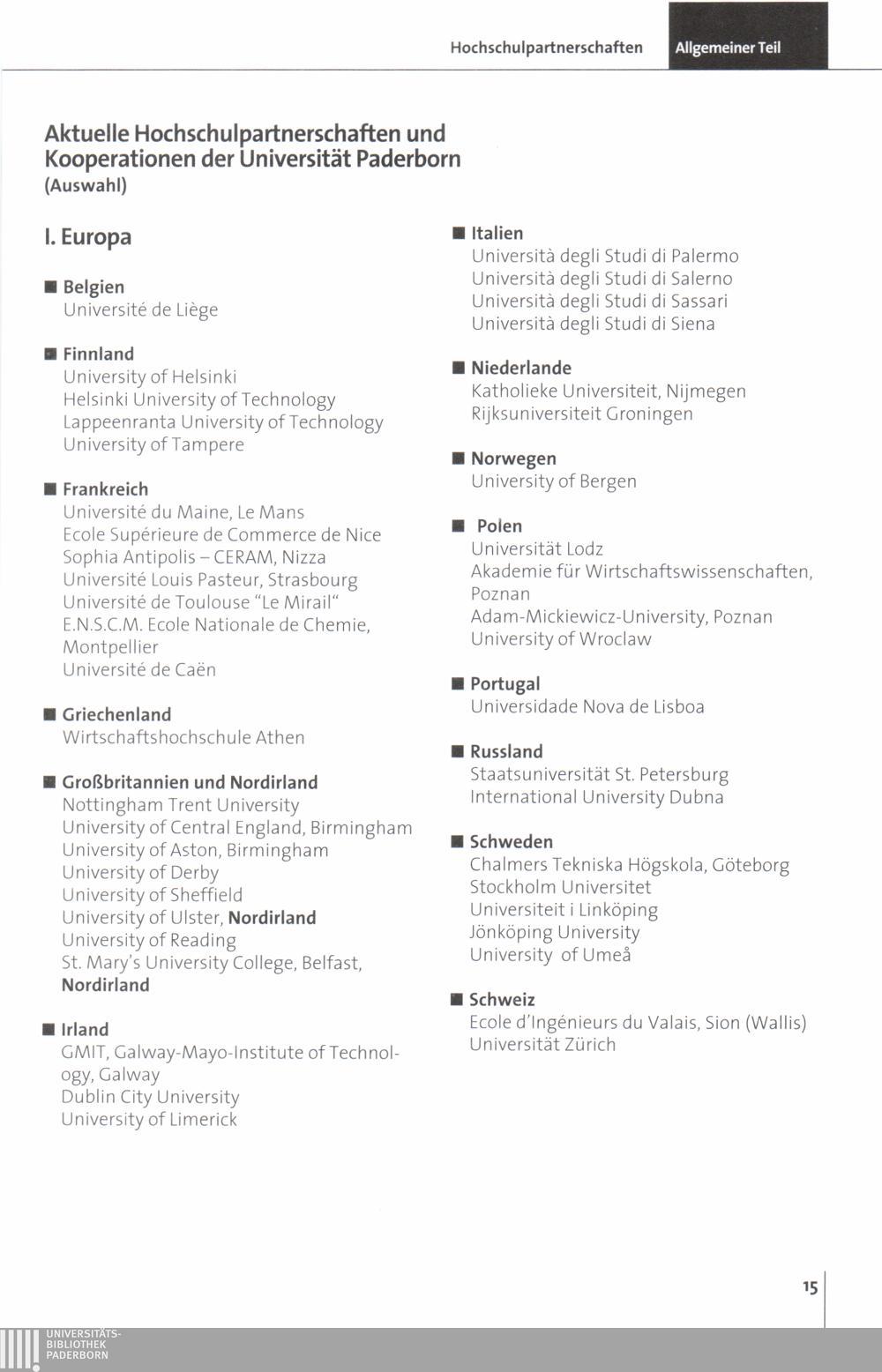 Aktuelle Hochschulpartnerschaften und Kooperationen der Universität Paderborn
