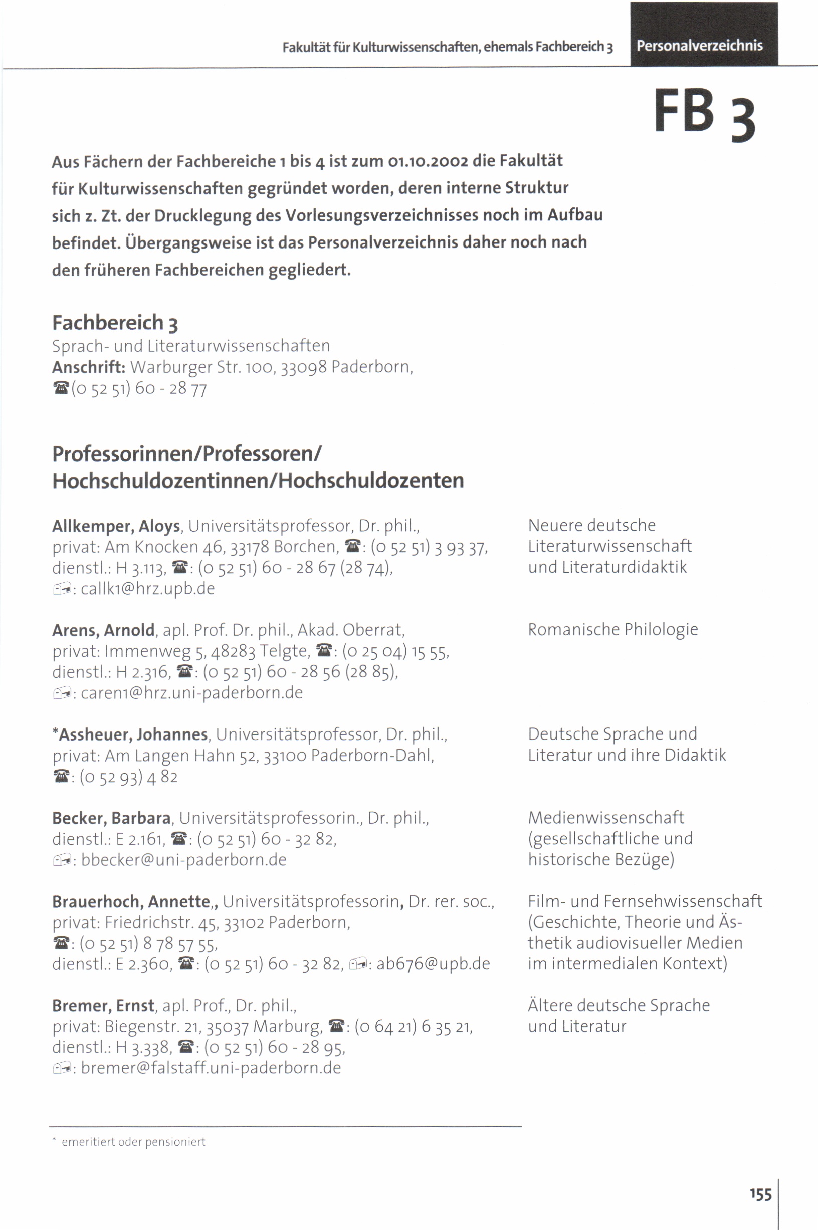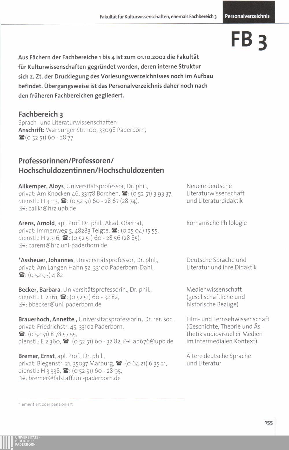 Personal- und Vorlesungsverzeichnis für die Universität Paderborn