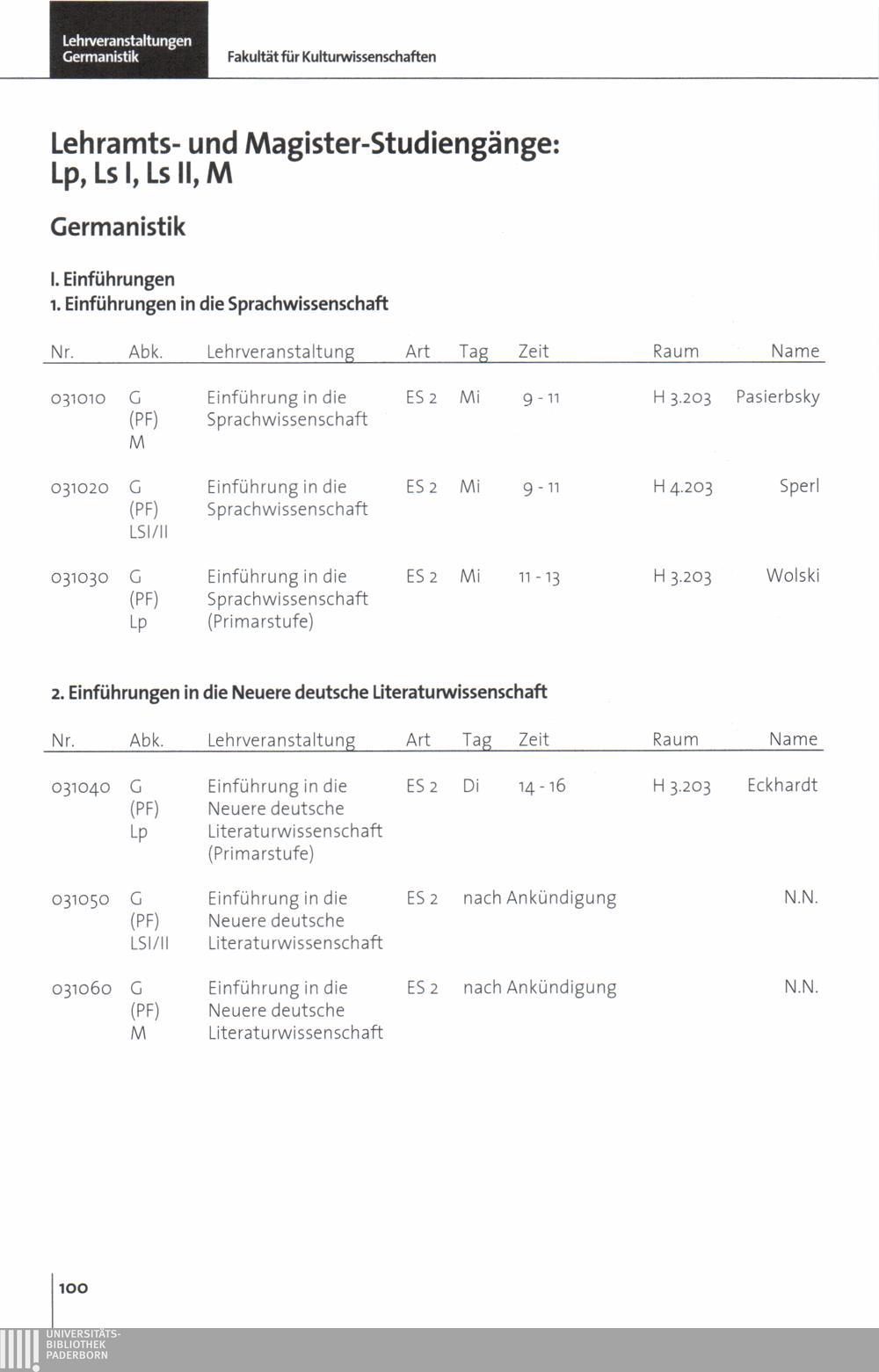 Personal- und Vorlesungsverzeichnis für die Universität Paderborn