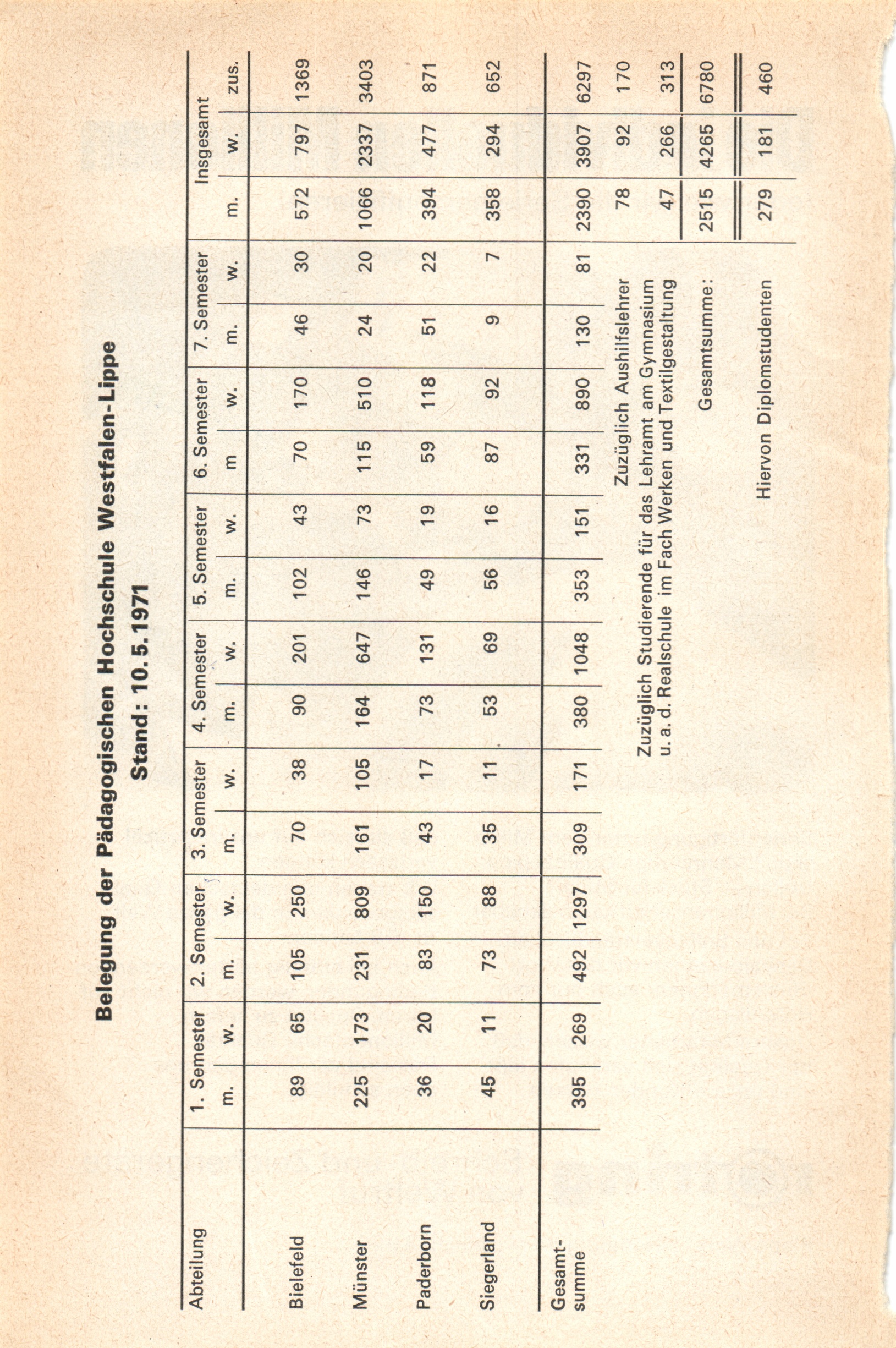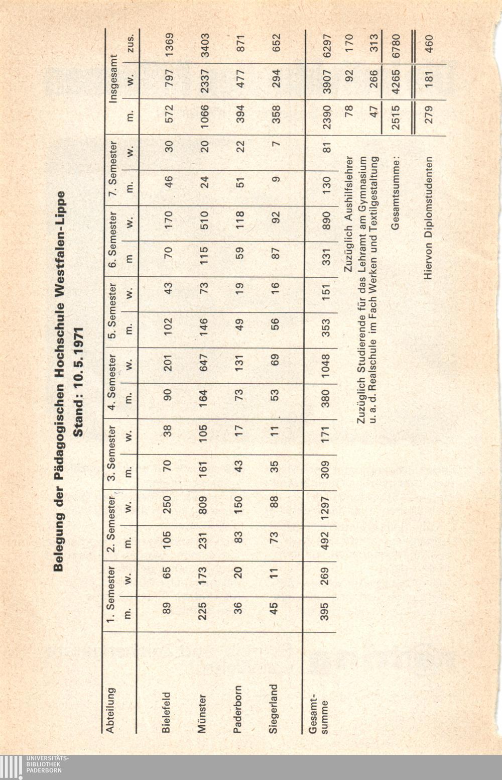 Belegung der Pädagogischen Hochschule Westfalen-Lippe, Stand: 10.5.1971