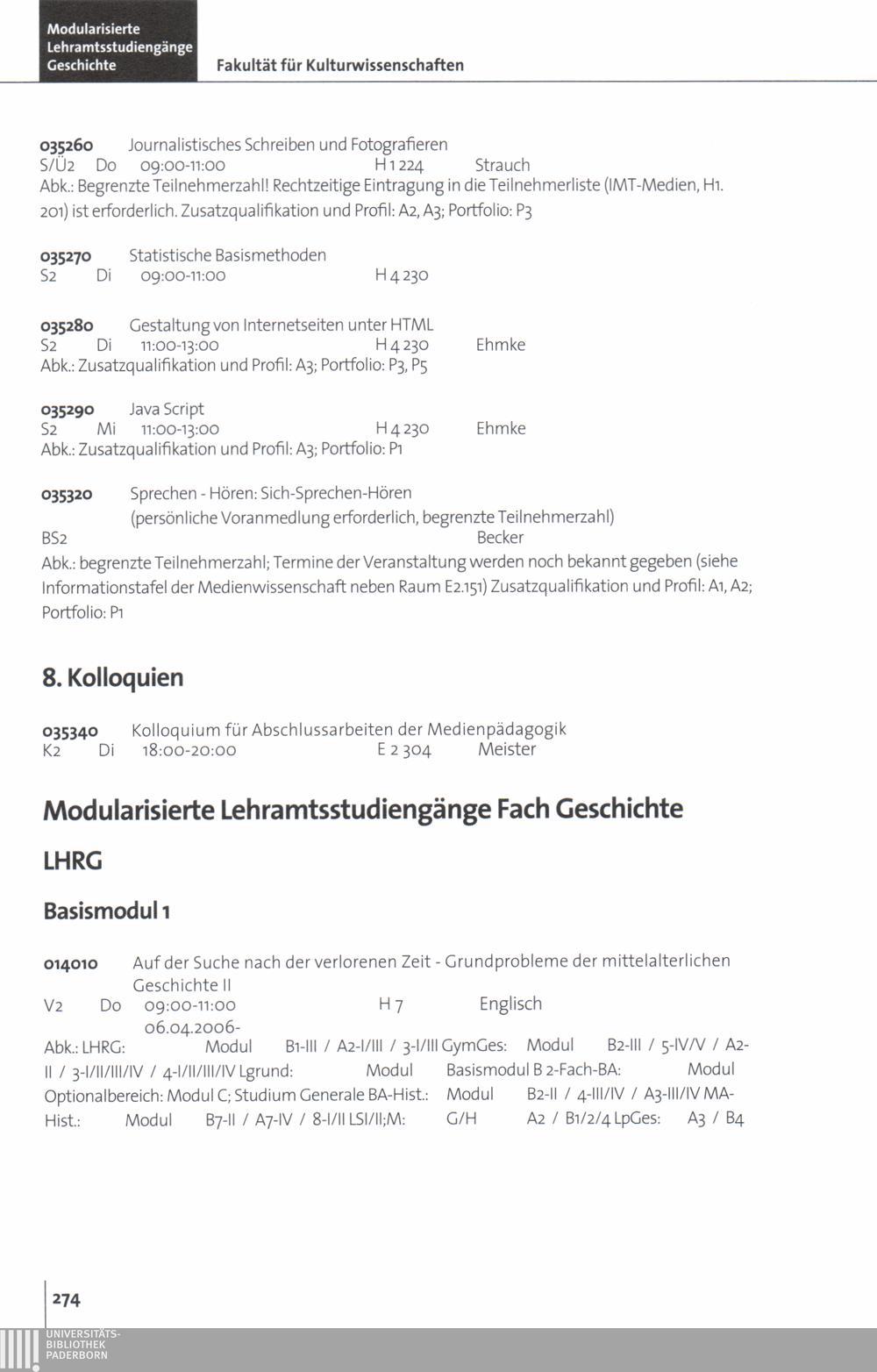 Personal- und Vorlesungsverzeichnis für die Universität Paderborn