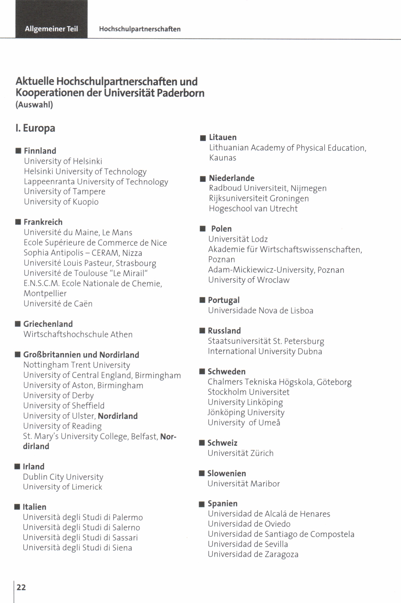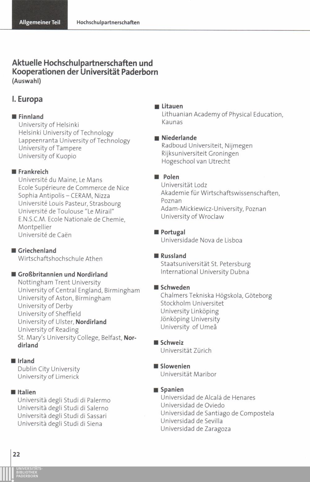 Aktuelle Hochschulpartnerschaften und Kooperationen der Universität Paderborn