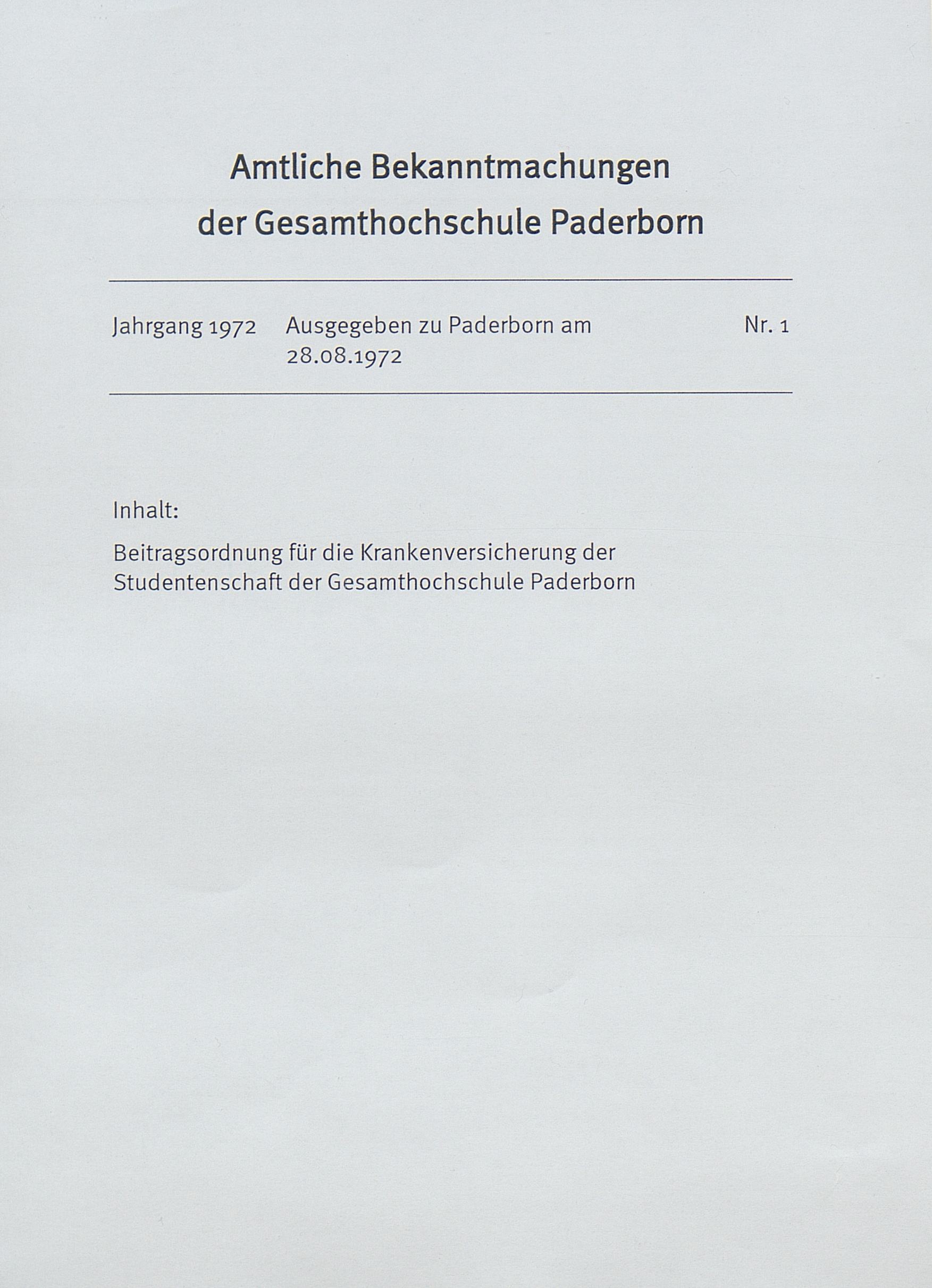 Nr. 1: Beitragsordnung für die Krankenversicherung der Studentenschaft der Gesamthochschule Paderborn (28.8.1972)