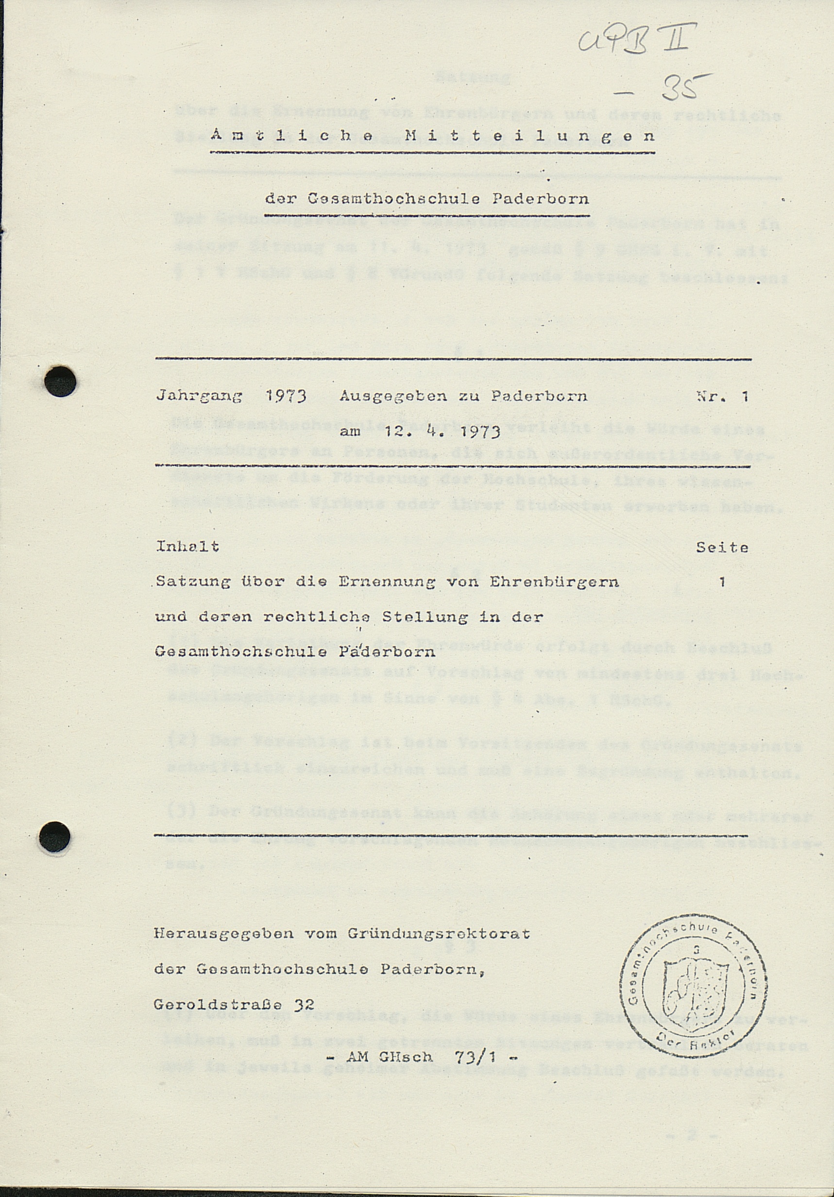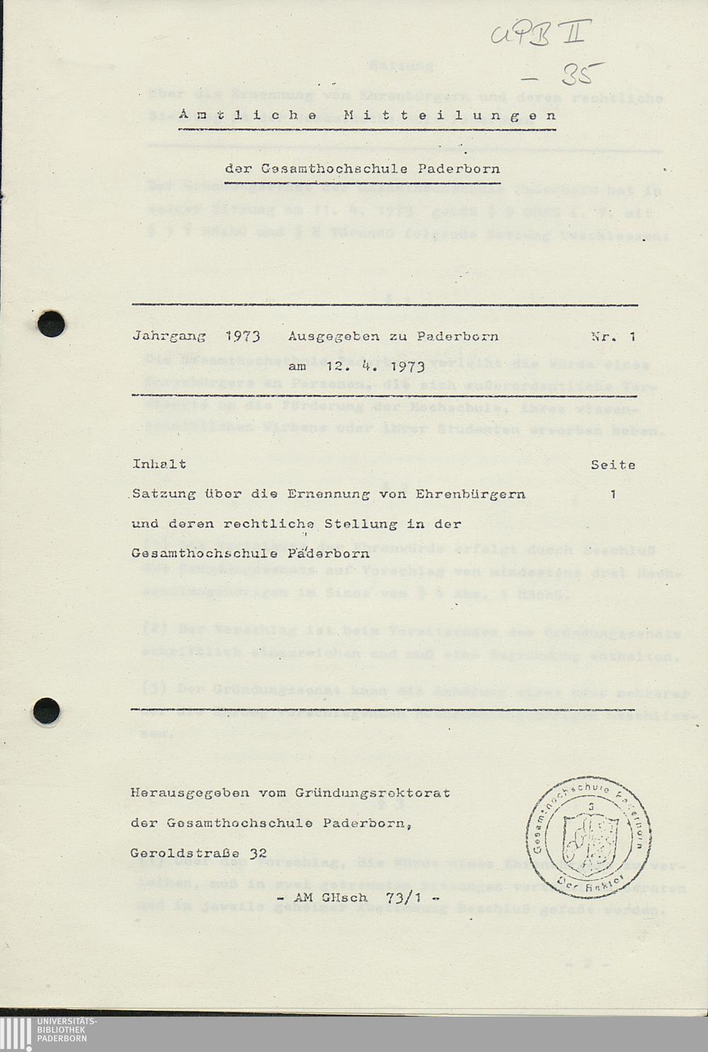 Nr. 1: Satzung über die Ernennung von Ehrenbürgern und deren rechtliche Stellung in der Gesamthochschule Paderborn (12.4.1973)