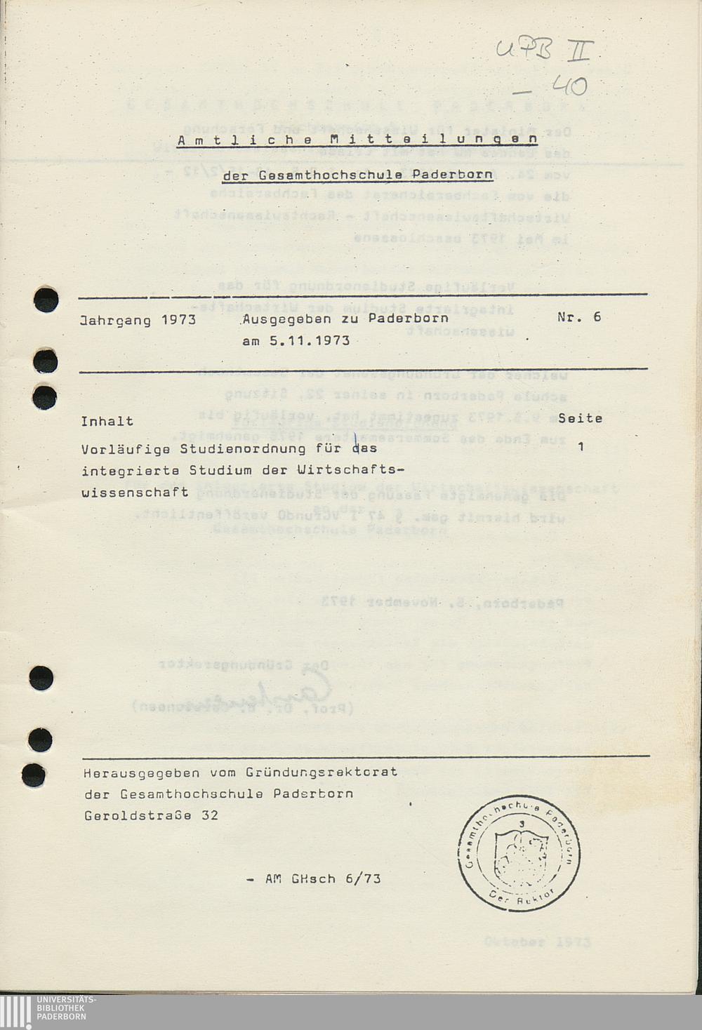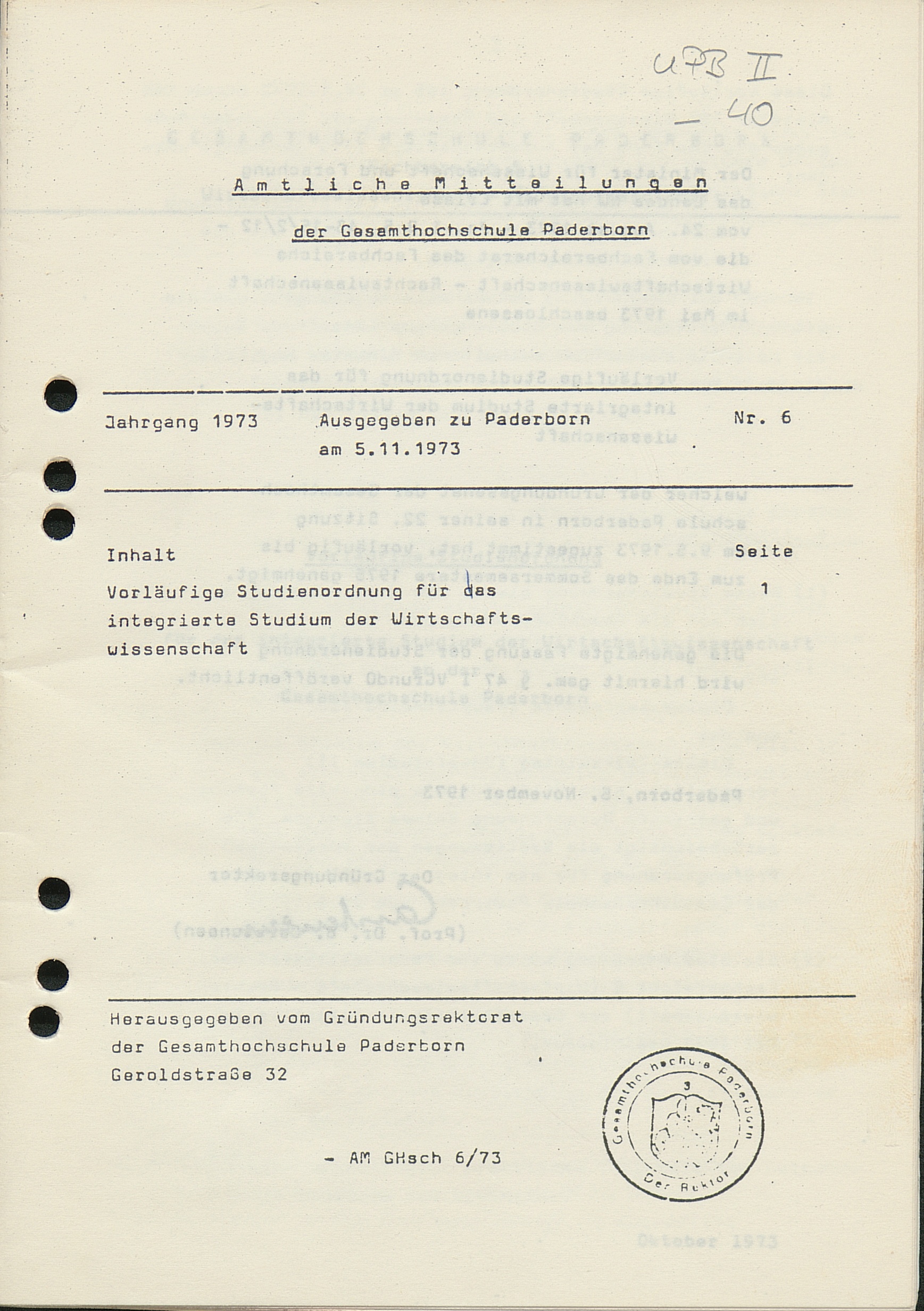 Nr. 6: Vorläufige Studienordnung für das integrierte Studium der Wirtschaftswissenschaft (5.11.1973)