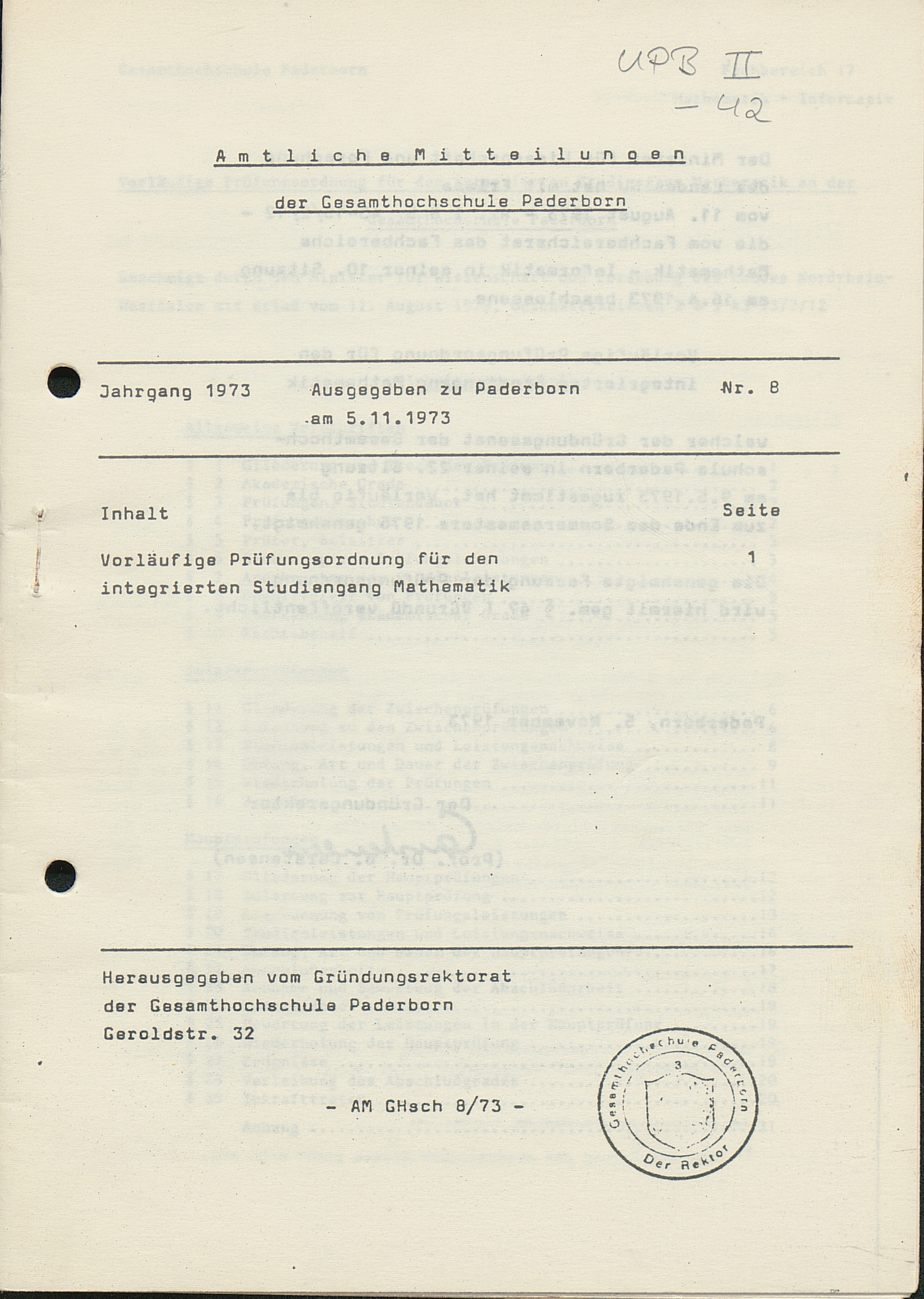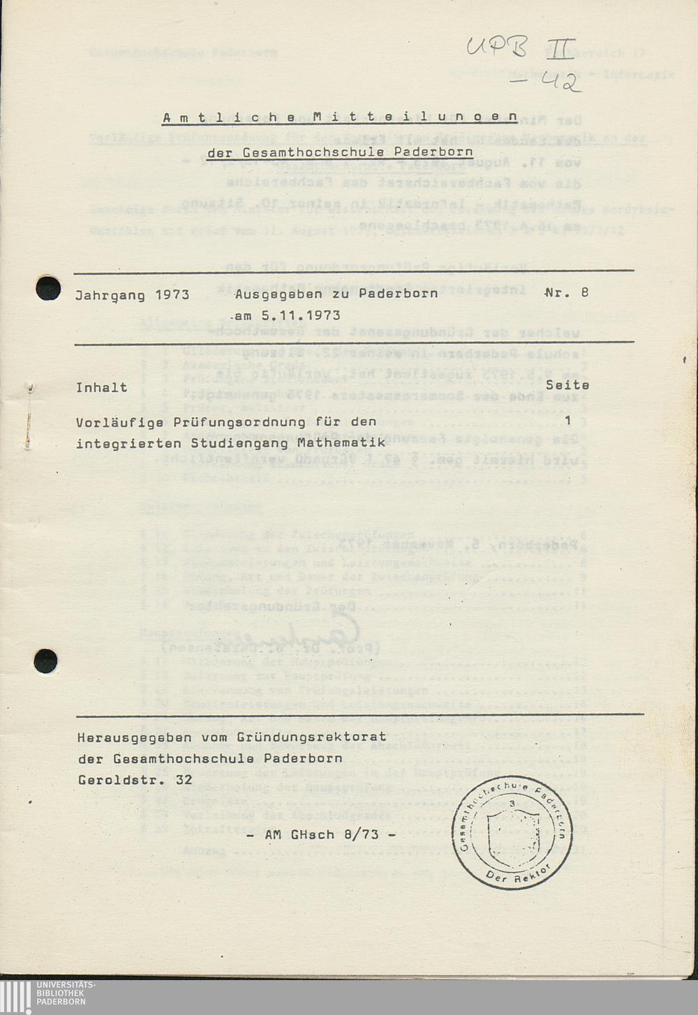 Nr. 8: Vorläufige Prüfungsordnung für den integrierten Studiengang Mathematik (5.11.1973)