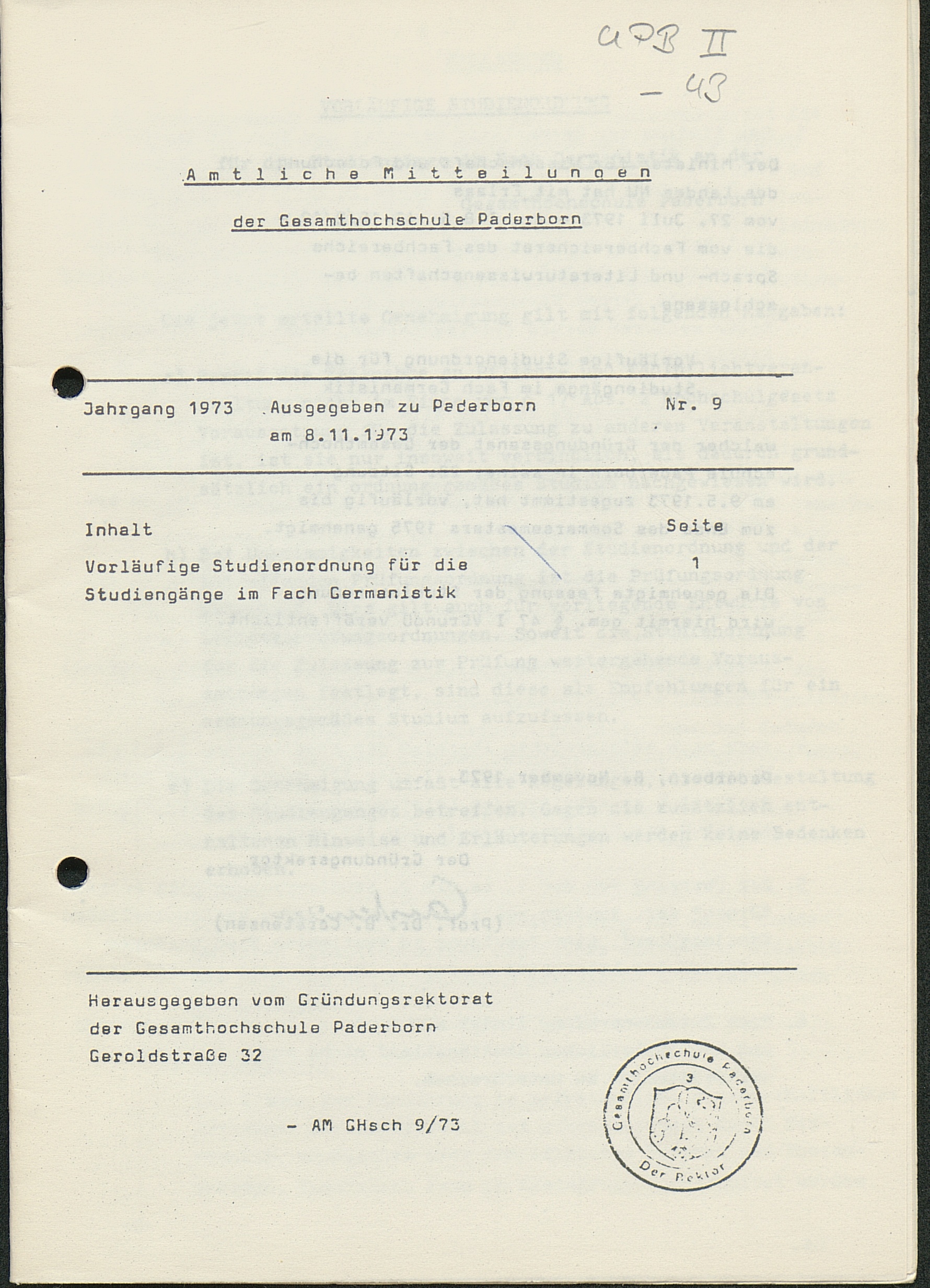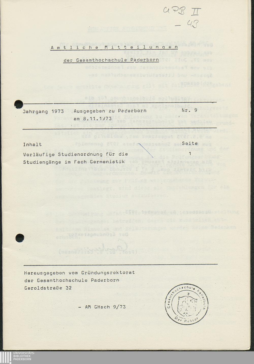 Nr. 1: Satzung über die Ernennung von Ehrenbürgern und deren rechtliche Stellung in der Gesamthochschule Paderborn (12.4.1973)