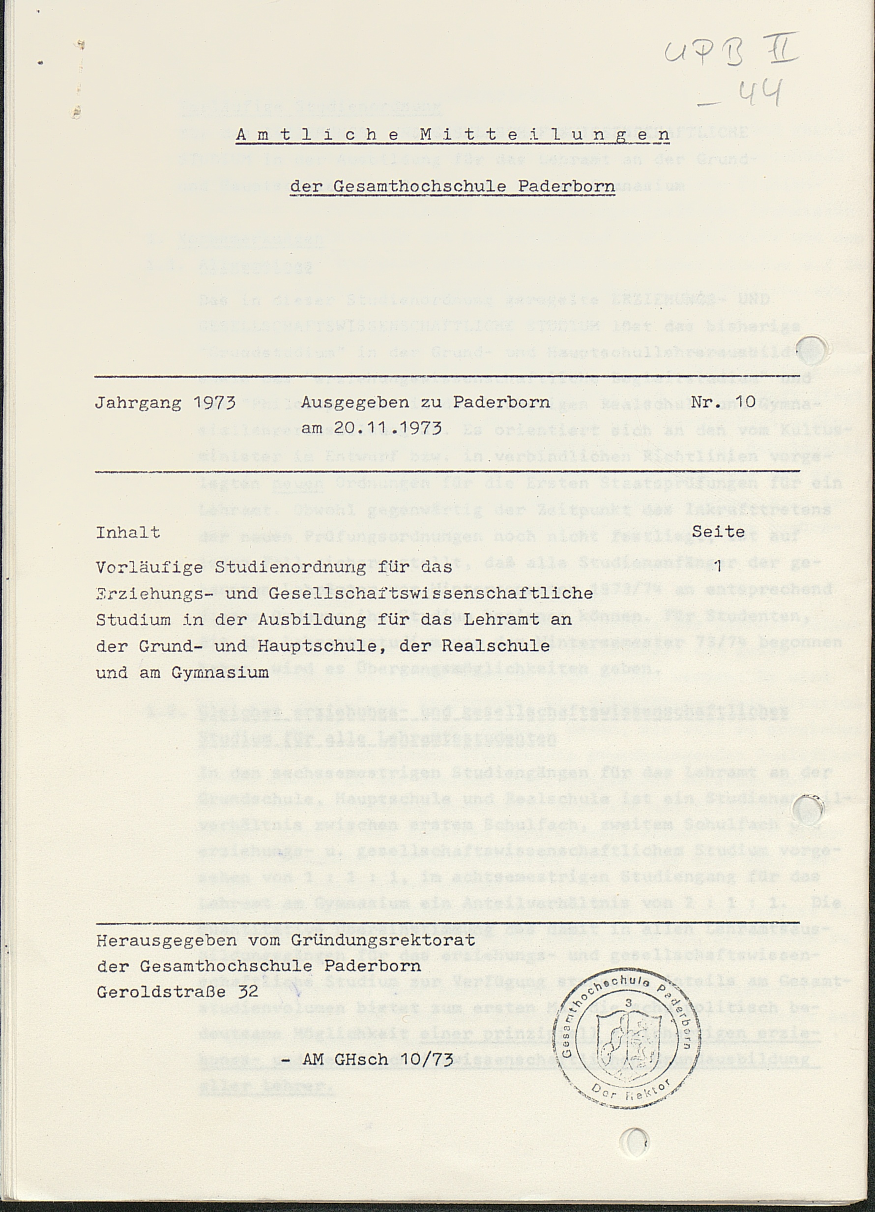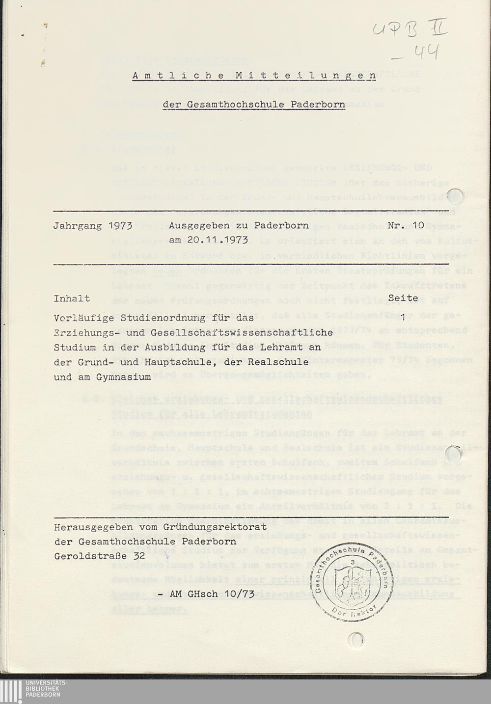 Nr. 10: Vorläufige Studienordnung für das erziehungs- und gesellschaftswissenschaftliche Studium in der Ausbildung für das Lehramt an der Grund- und Hauptschule, der Realschule und am Gymnasium (20.11.1973)