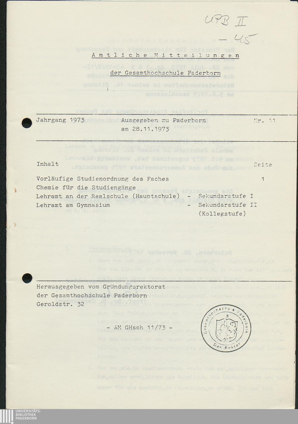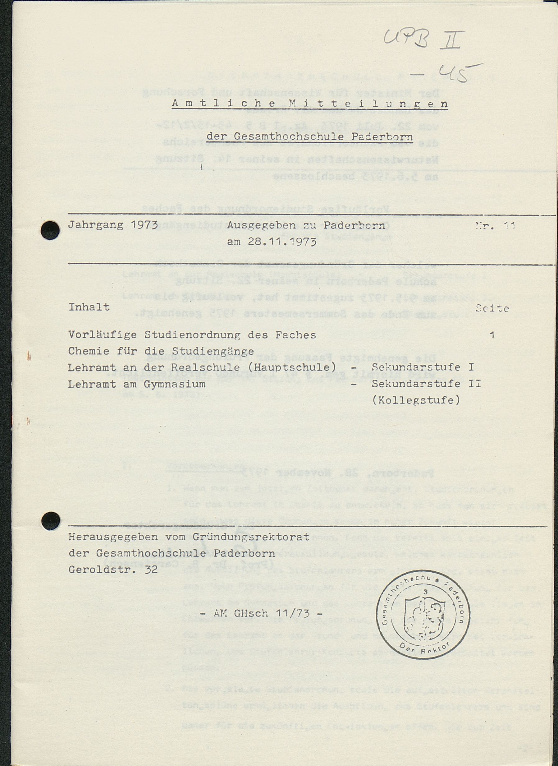 Nr. 11: Vorläufige Studienordnung des Faches Chemie für die Studiengänge Lehramt an der Realschule (Hauptschule) - Sekundarstufe I, Lehramt am Gymnasium - Sekundarstufe II (Kollegstufe) (28.11.1973)