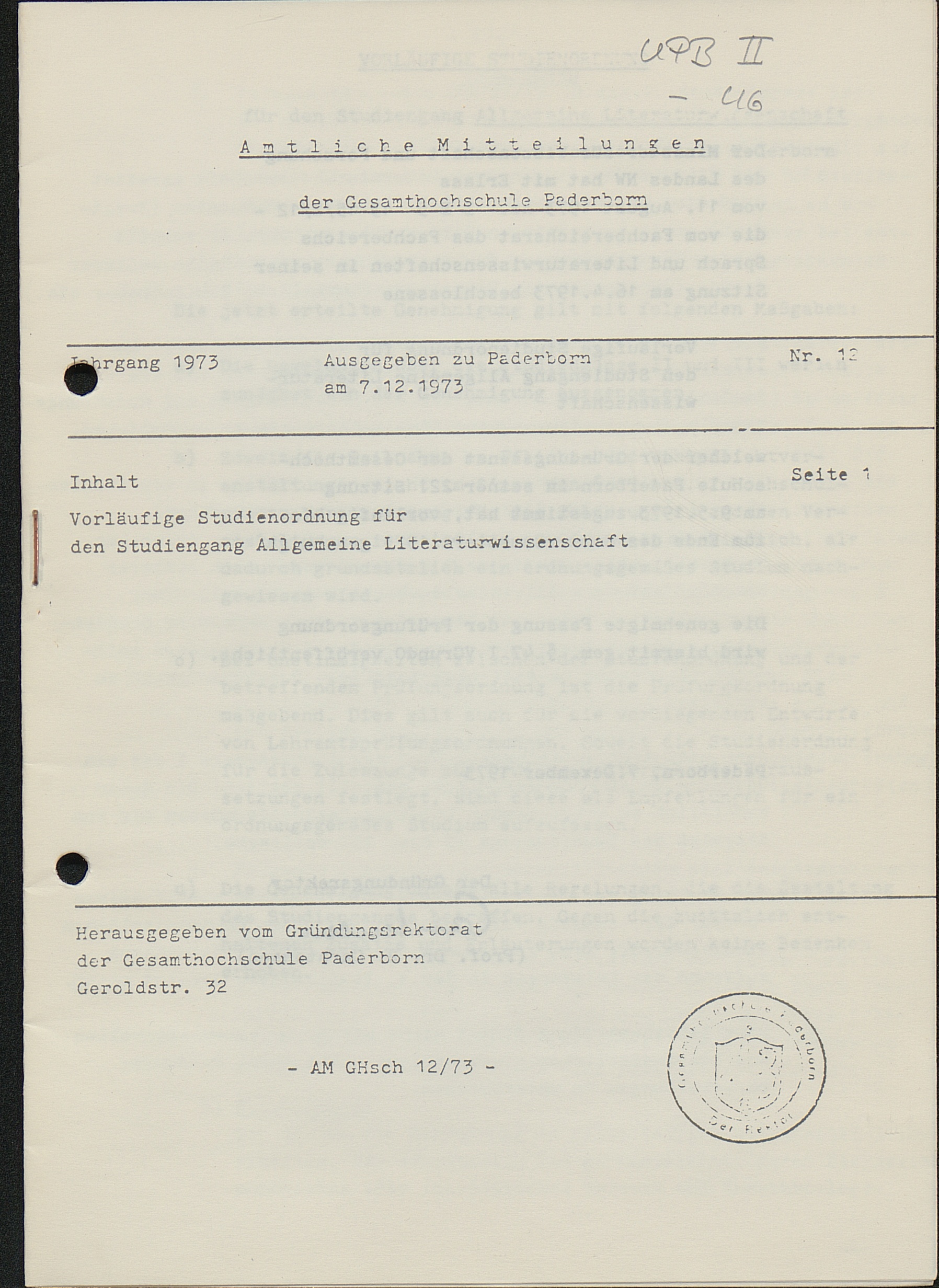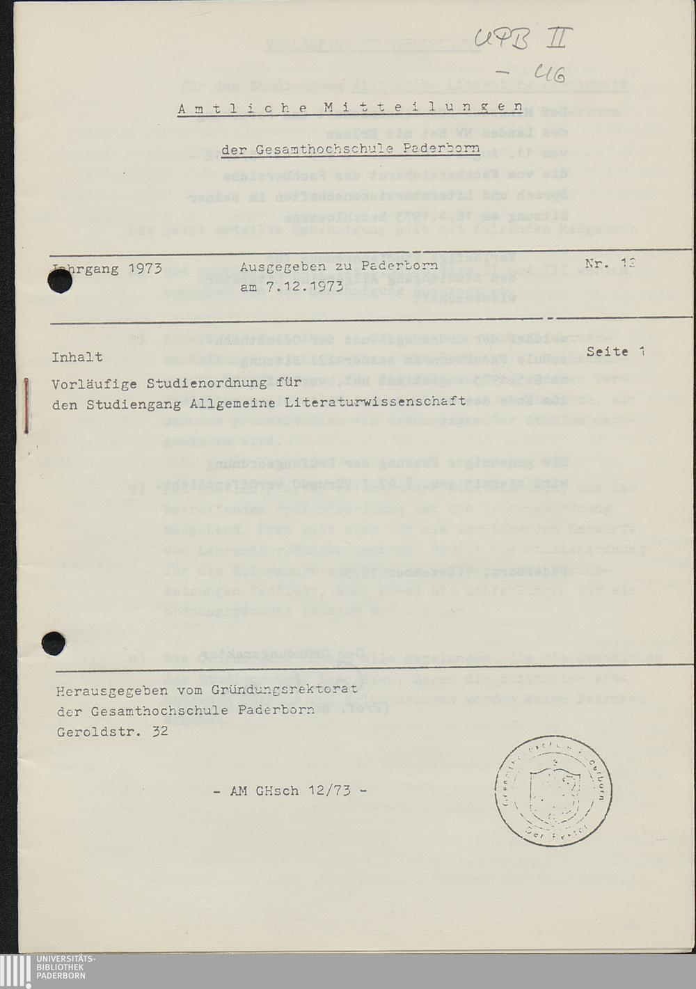 Nr. 12: Vorläufige Studienordnung für den Studiengang Allgemeine Literaturwissenschaft (7.12.1973)