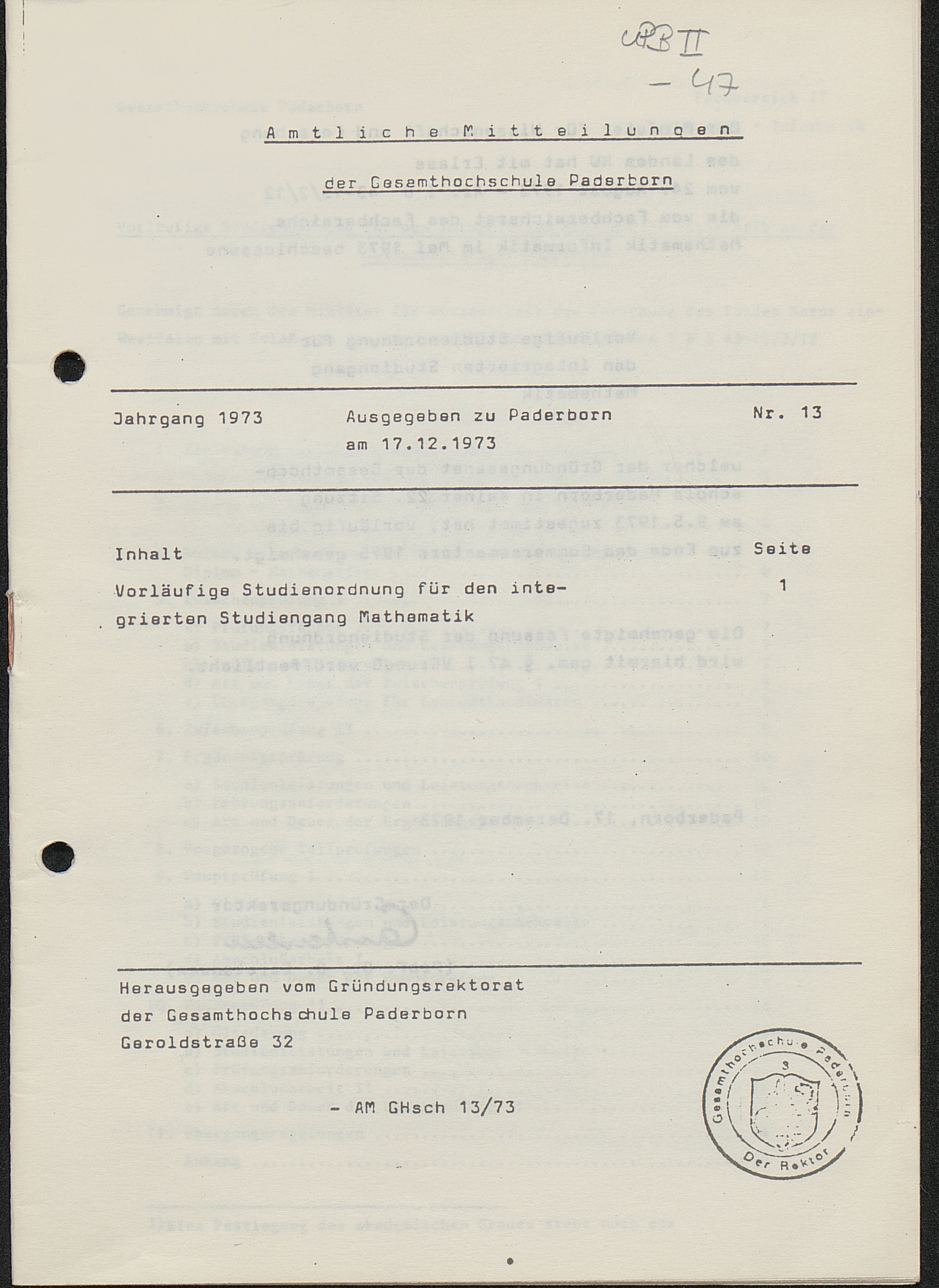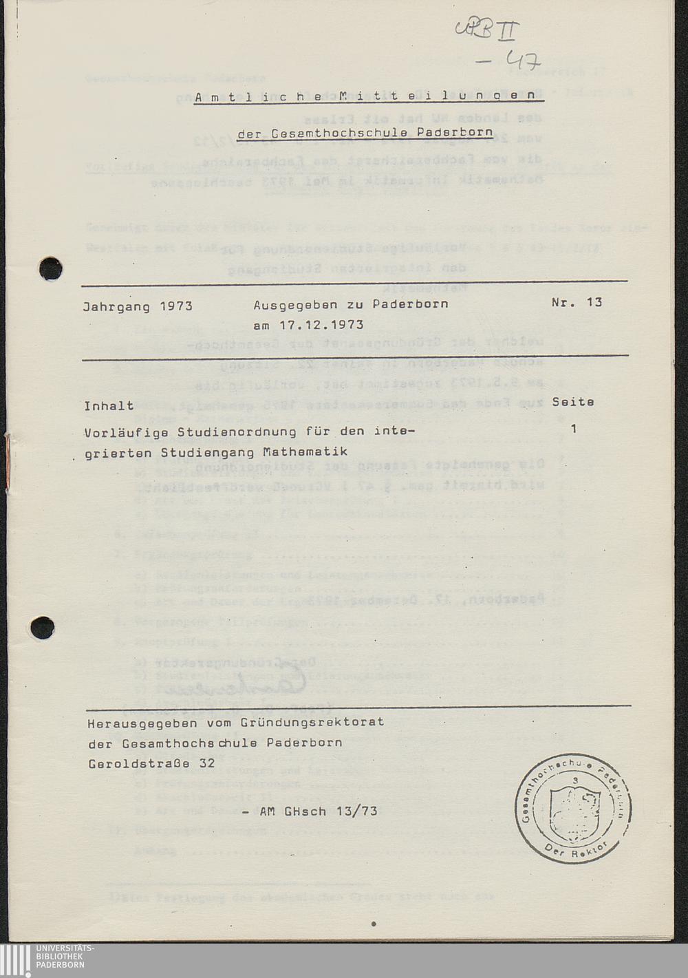 Nr. 13: Vorläufige Studienordnung für den integrierten Studiengang Mathematik (17.12.1973)
