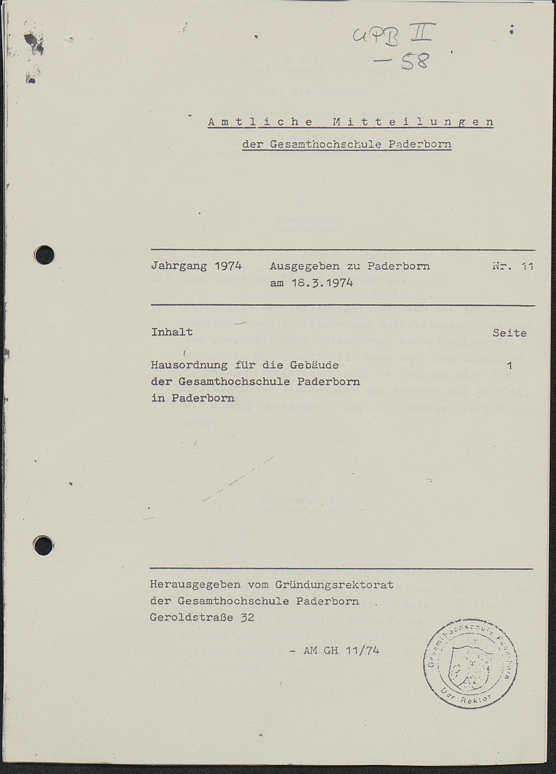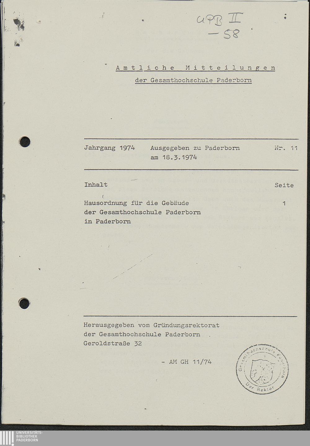 Nr. 11: Hausordnung für die Gebäude der Gesamthochschule Paderborn in Paderborn [...]