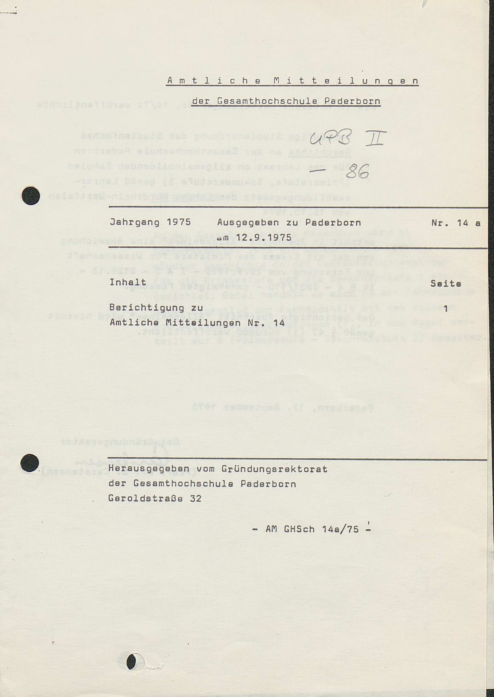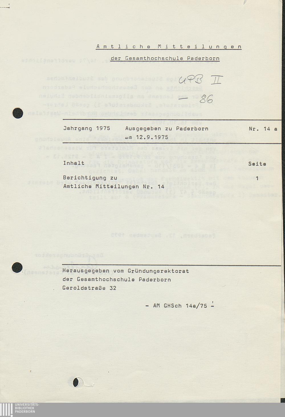 Nr. 14a: Berichtigung zu Amtliche Mitteilungen Nr. 14 (12.9.1975)