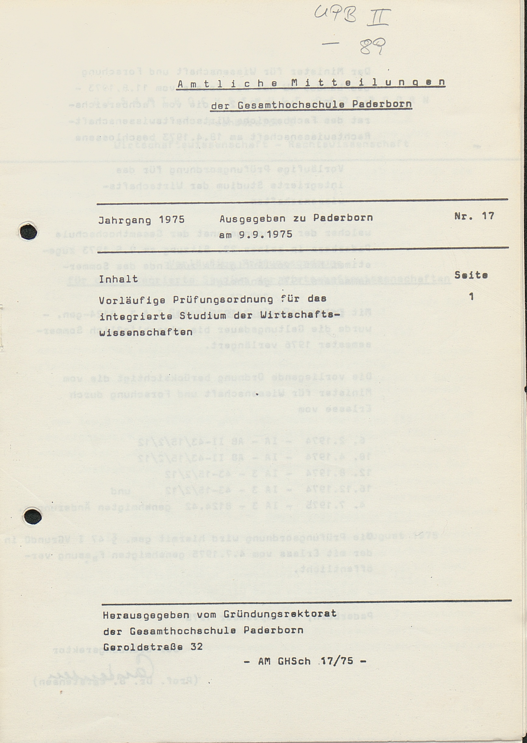 Nr. 17: Vorläufige Prüfungsordnung für das integrierte Studium der Wirtschaftswissenschaften[...]
