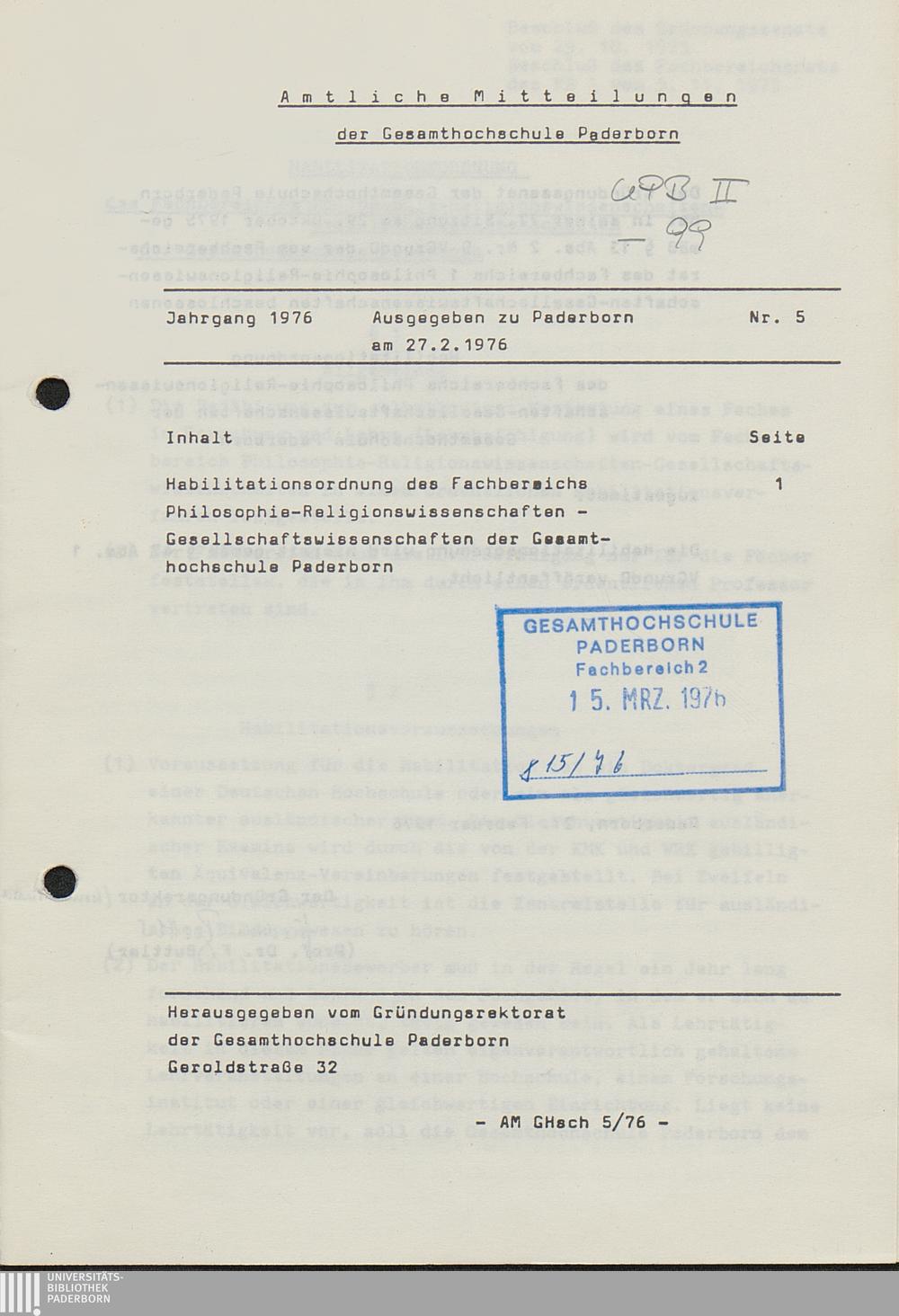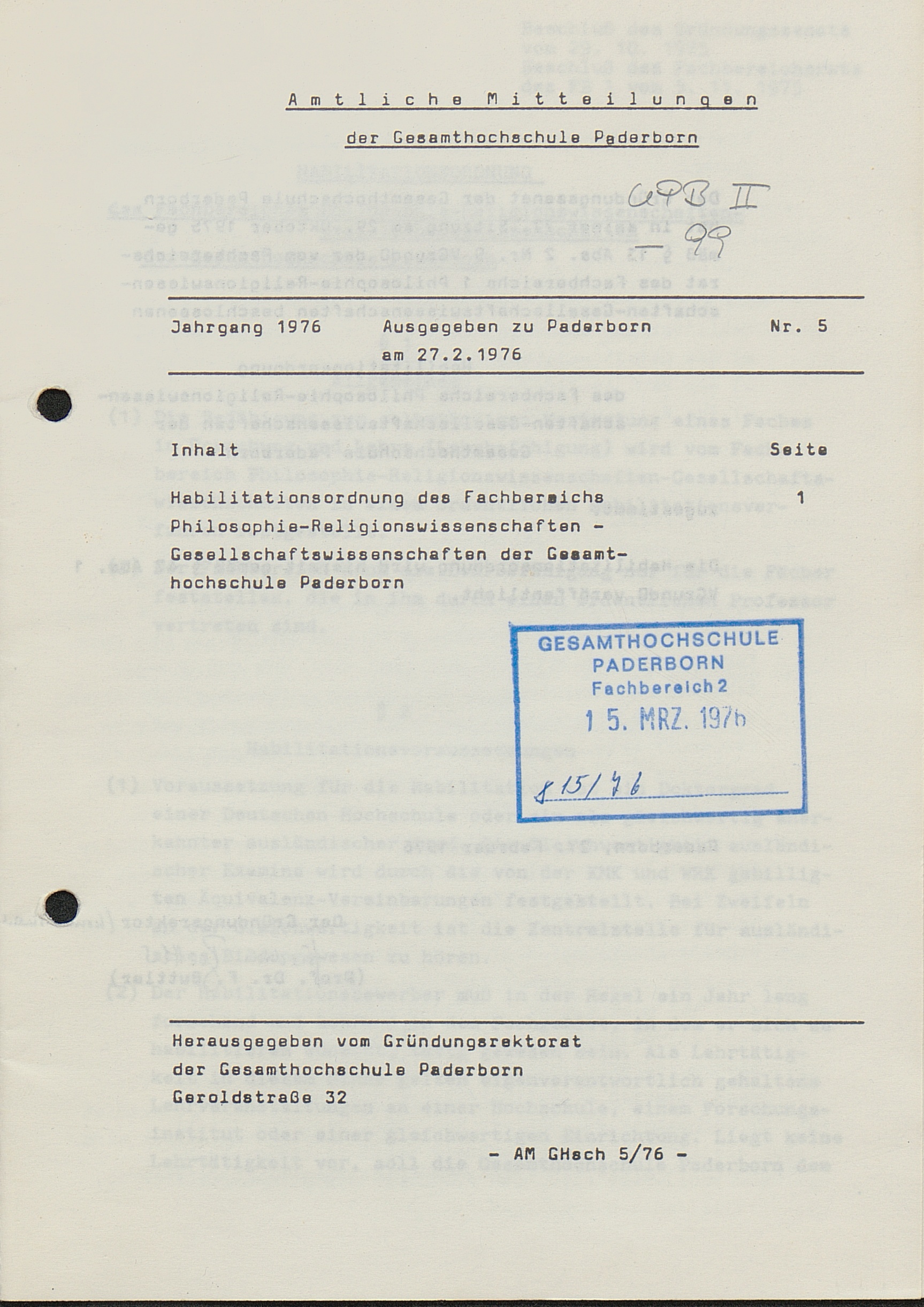 Nr. 5: Habilitationsordnung des Fachbereichs Philosophie-Religionswissenschaften - Gesellschaftswissenschaften der Gesamthochschule Paderborn (27.2.1976)