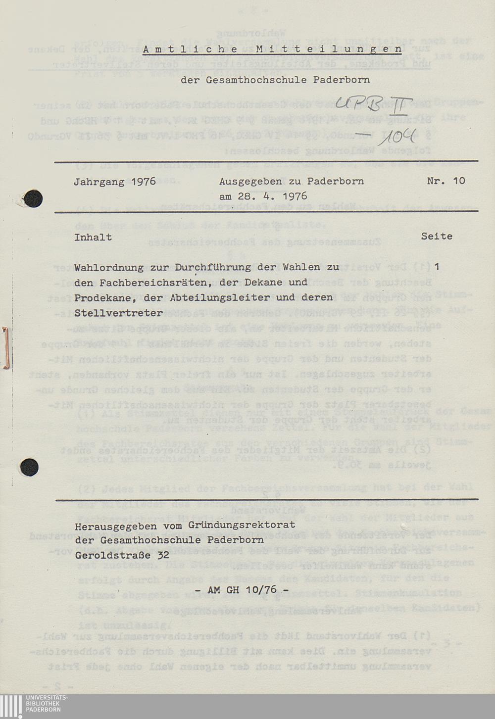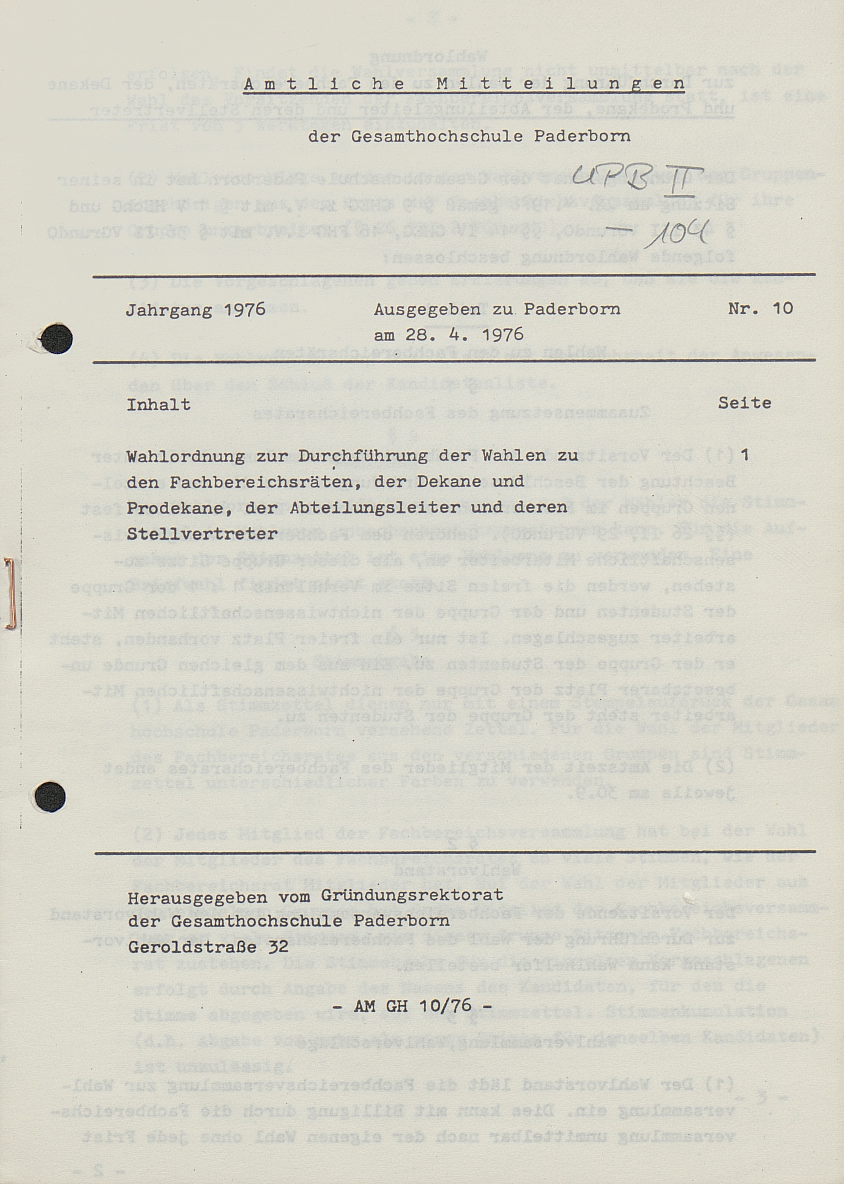 Nr. 10: Wahlordnung zur Durchführung der Wahlen zu den Fachbereichsräten, der Dekane und Prodekane, der Abteilungsleiter und deren Stellvertreter (28.4.1976)