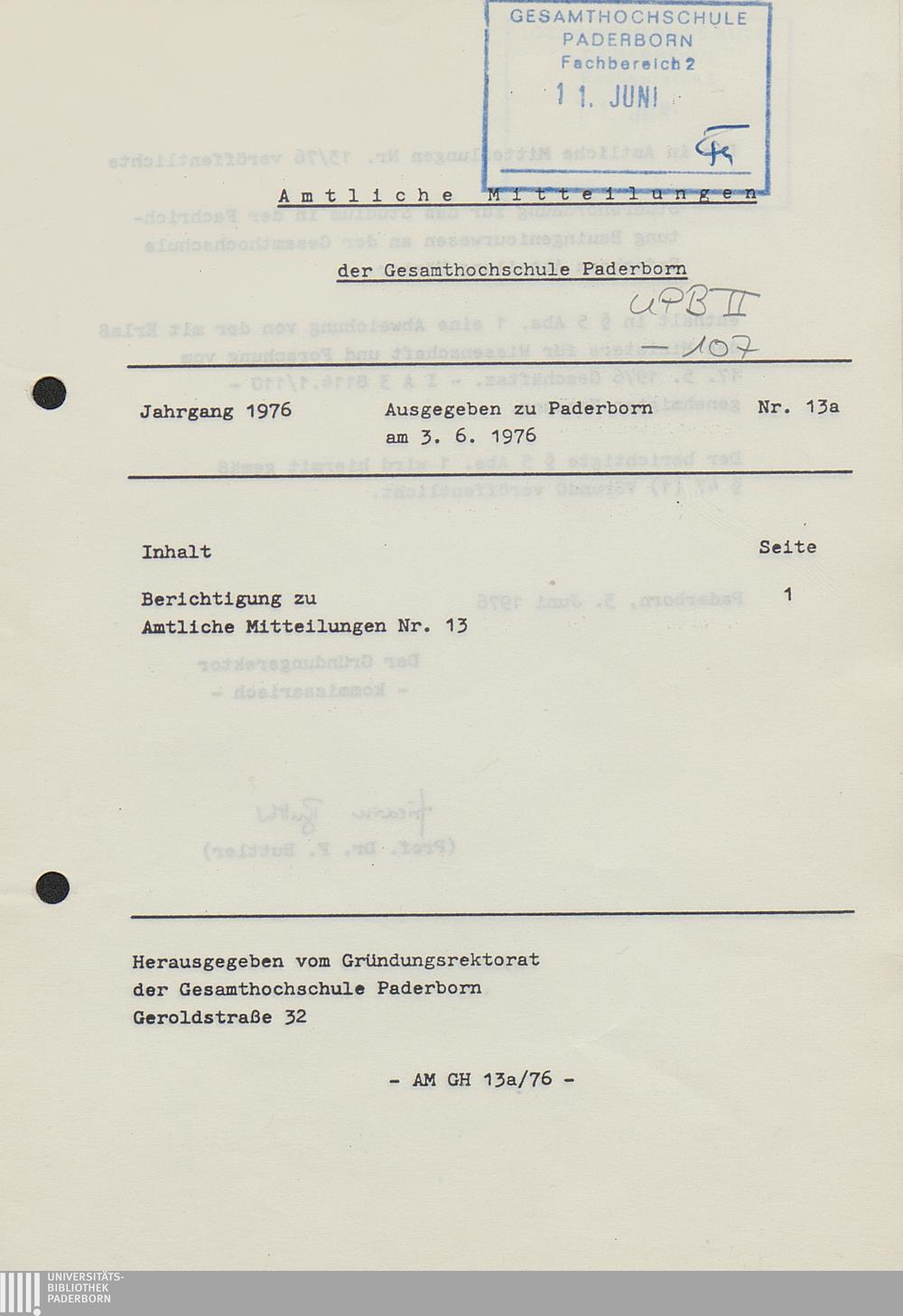 Nr. 13a: Berichtigung zu Amtliche Mitteilungen Nr. 13 (3.6.1976)
