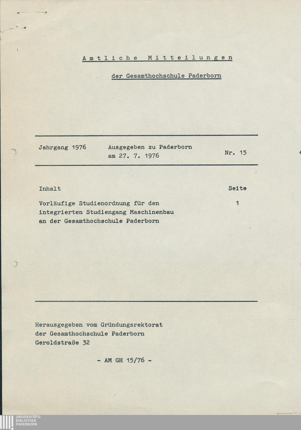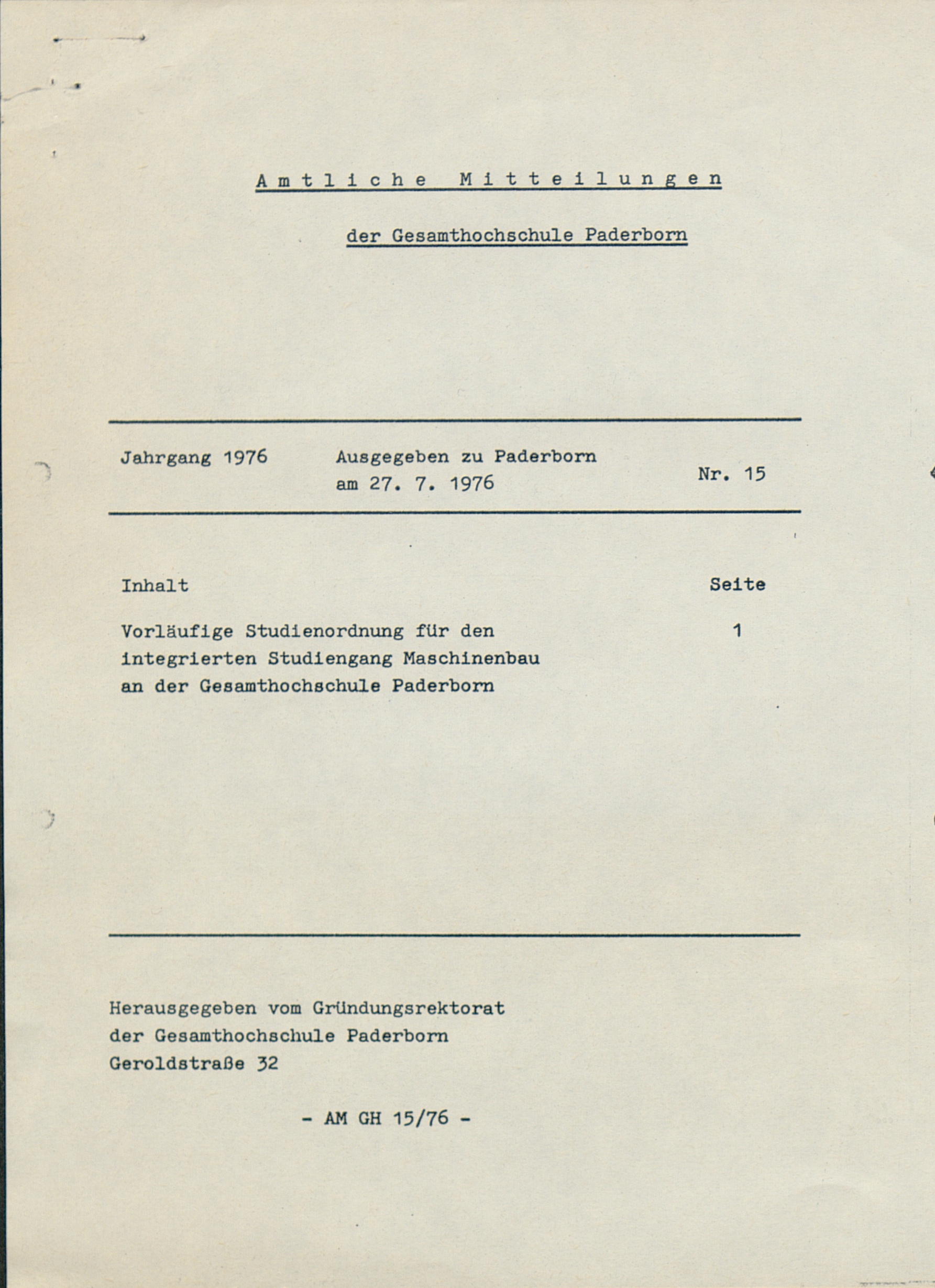 Nr. 15: Vorläufige Studienordnung für den integrierten Studiengang Maschinenbau an der Gesamthochschule Paderborn (27.7.1976)