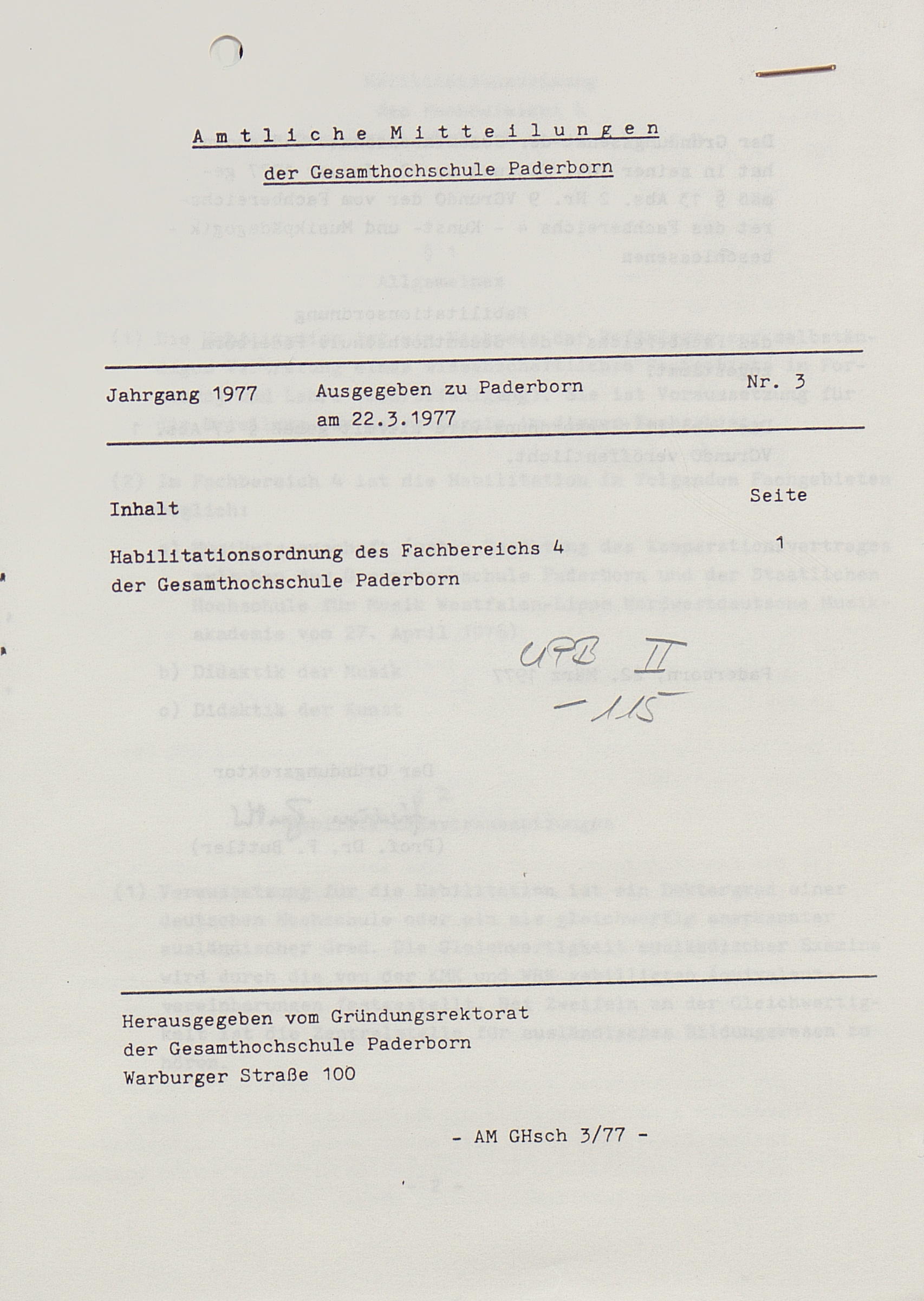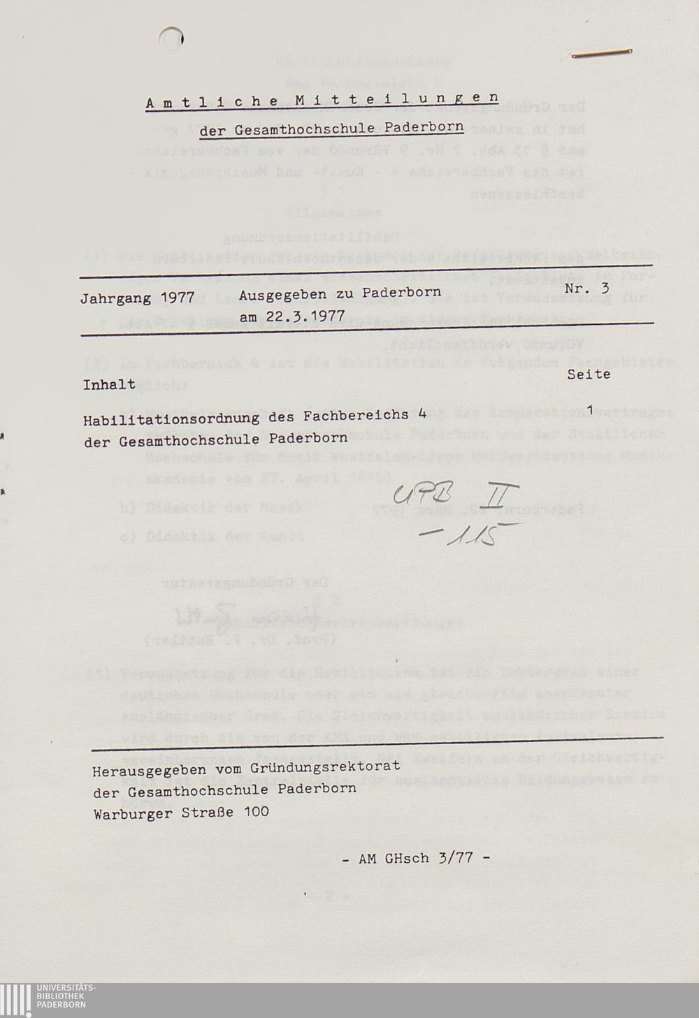 Nr. 3: Habilitationsordnung des Fachbereichs 4 der Gesamthochschule Paderborn (22.3.1977)