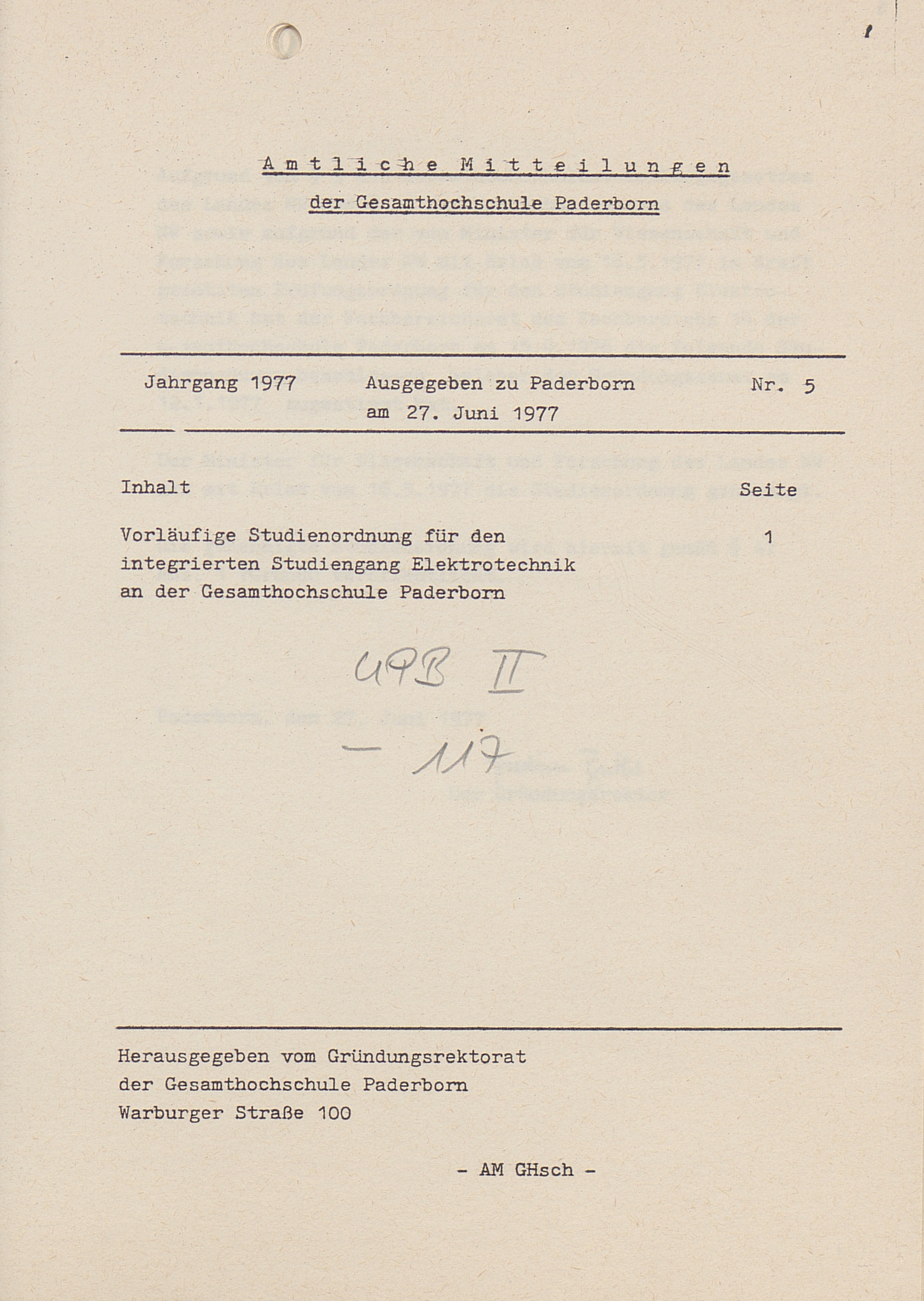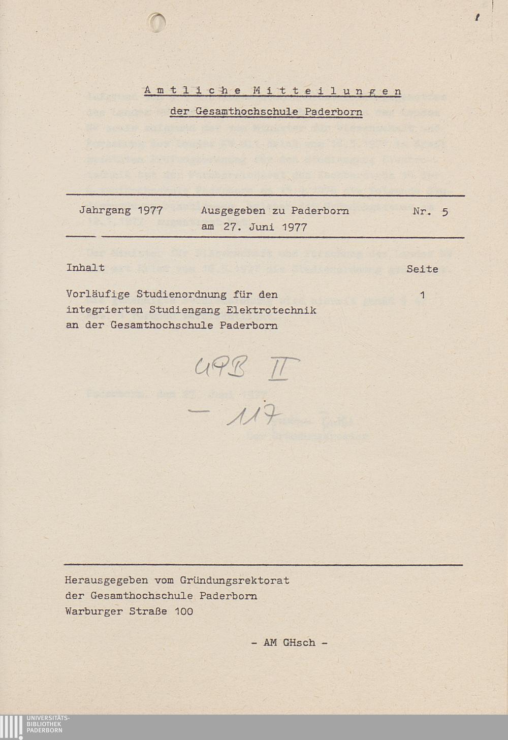 Nr. 5: Vorläufige Studienordnung für den integrierten Studiengang Elektrotechnik an der Gesamthochschule Paderborn (27. Juni 1977)