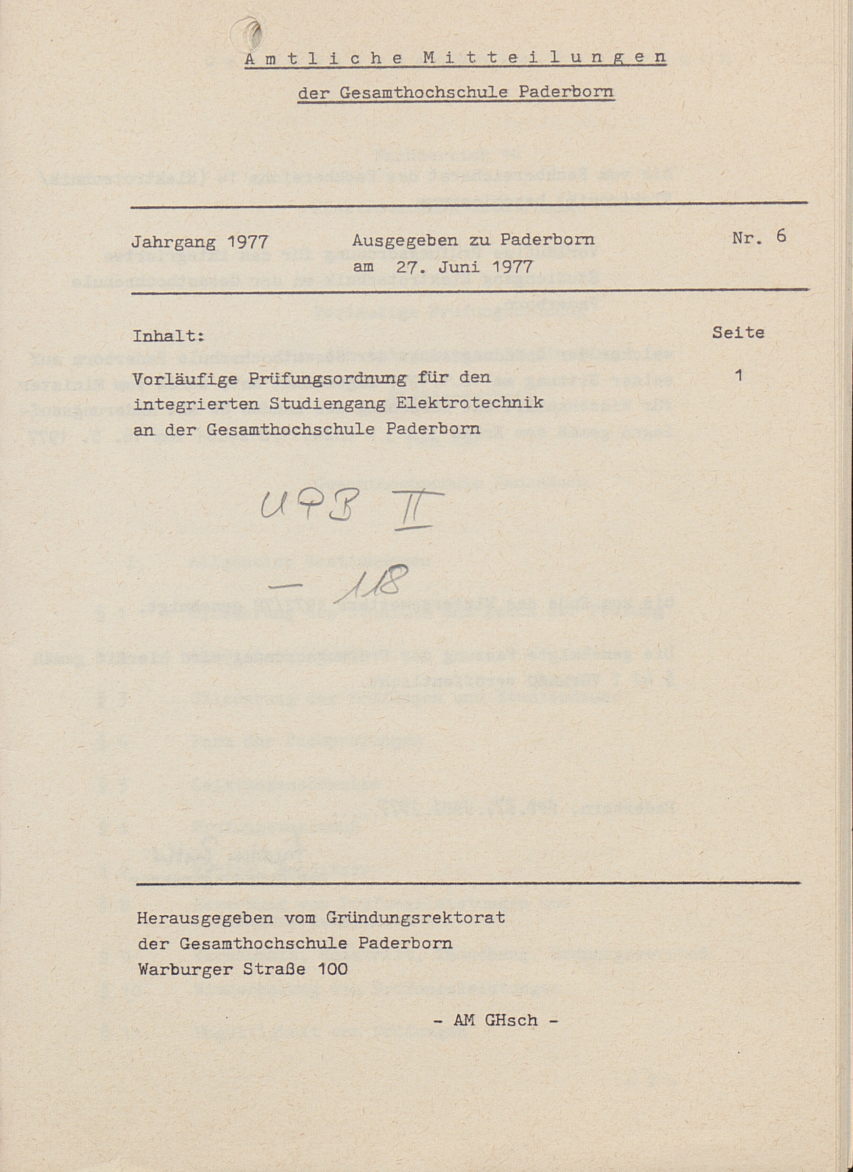 Nr. 6: Vorläufige Prüfungsordnung für den integrierten Studiengang Elektrotechnik an der Gesamthochschule Paderborn (27. Juni 1977)
