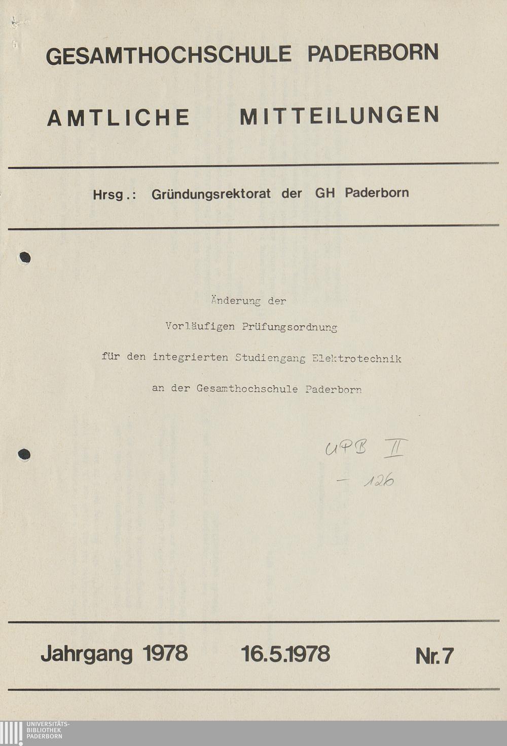 Nr. 7: Änderung der vorläufigen Prüfungsordnung für den integrierten Studiengang Elektrotechnik an der Gesamthochschule Paderborn (16.5.1978)