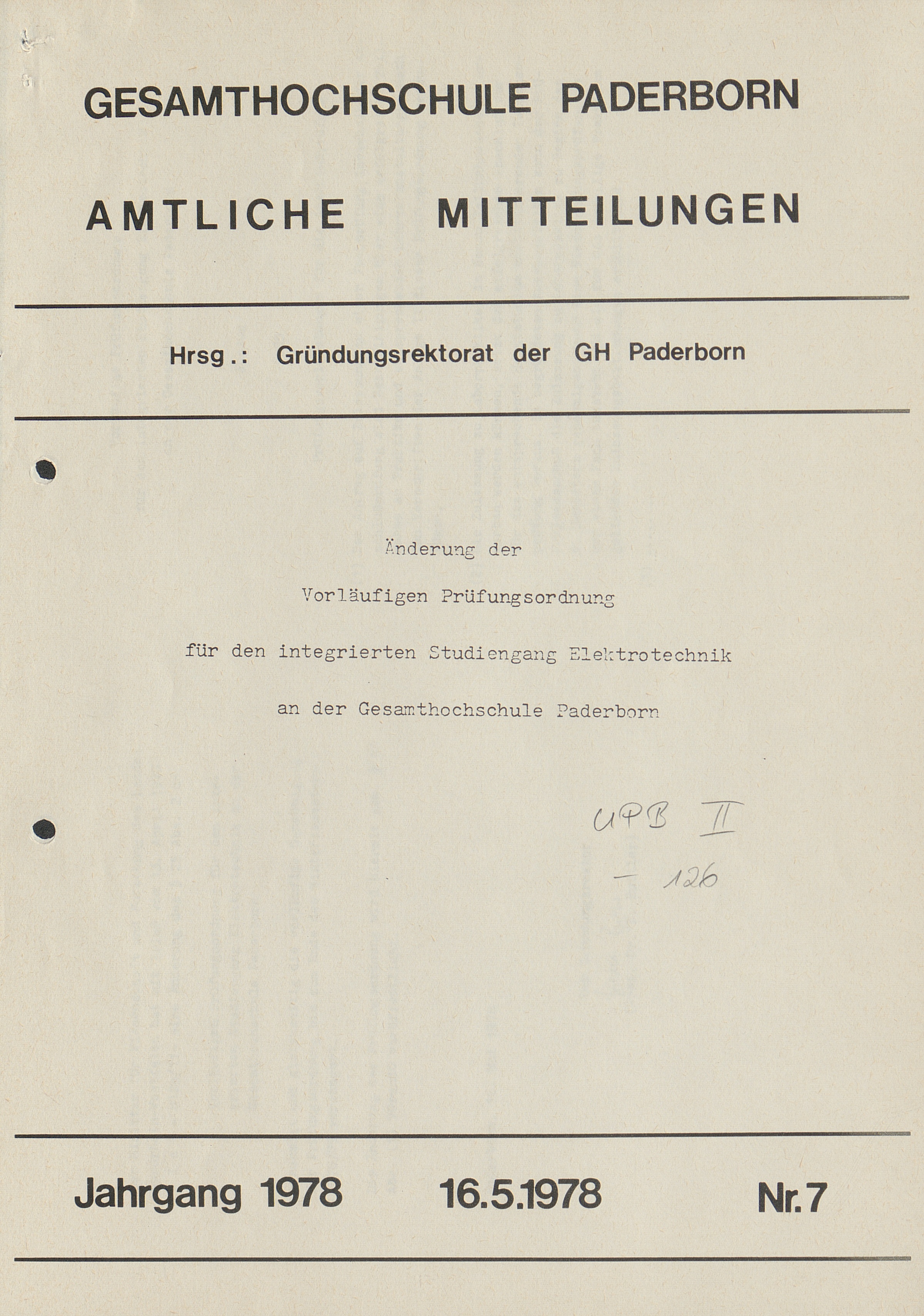 Nr. 7: Änderung der vorläufigen Prüfungsordnung für den integrierten Studiengang Elektrotechnik an der Gesamthochschule Paderborn (16.5.1978)