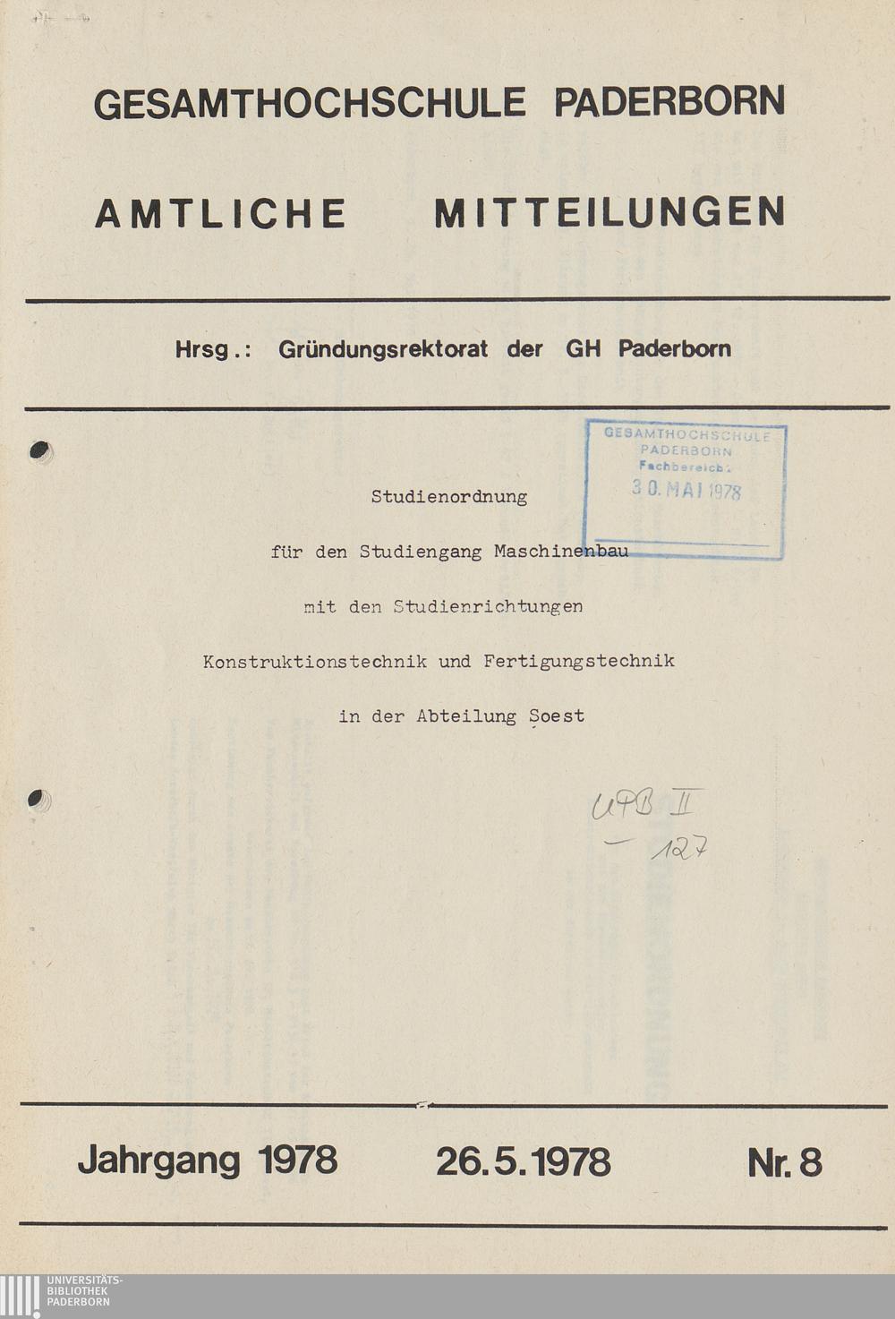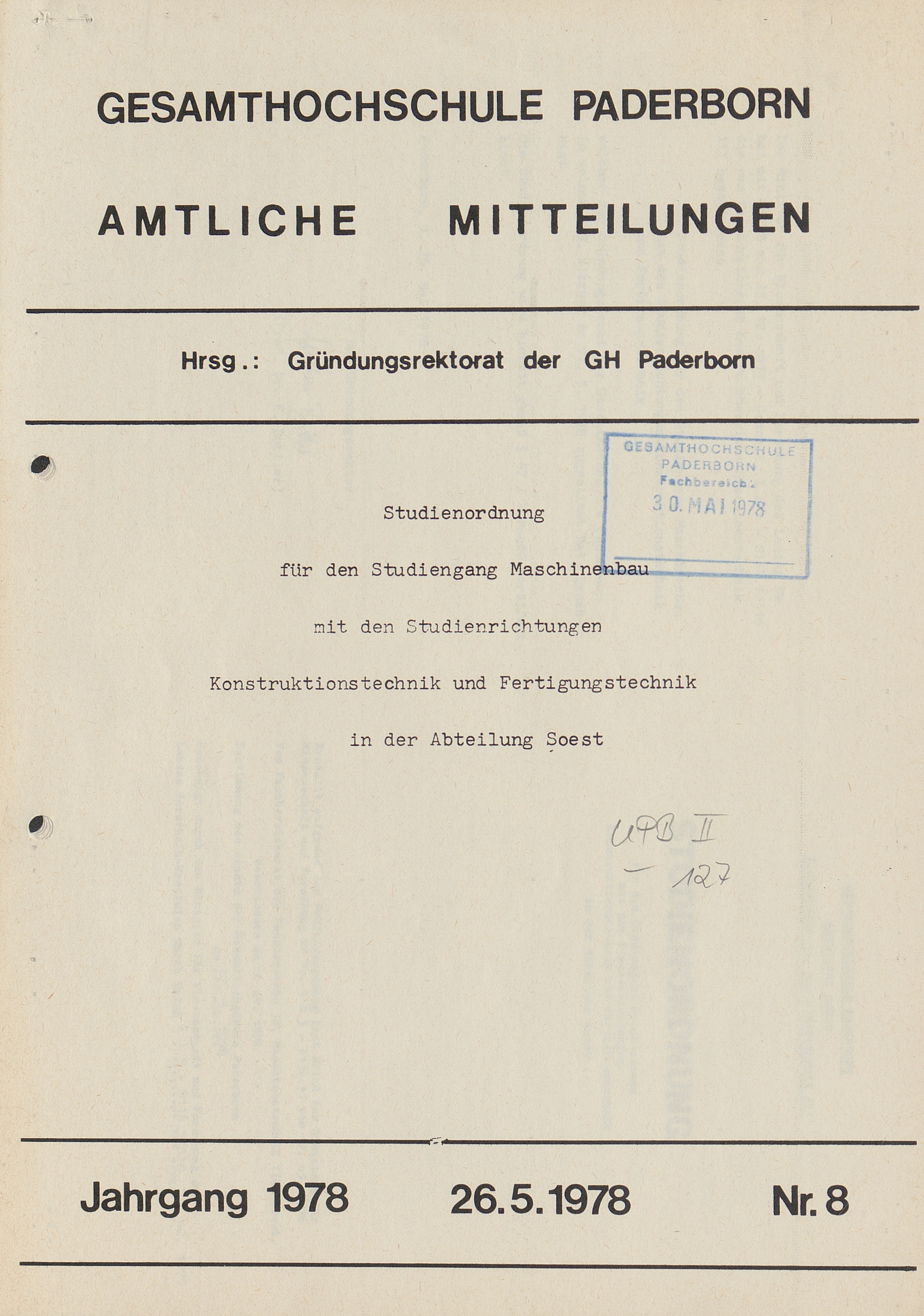 Nr. 8: Studienordnung für den Studiengang Maschinenbau mit den Studienrichtungen Konstruktionstechnik und Fertigungstechnik in der Abteilung Soest (26.5.1978)