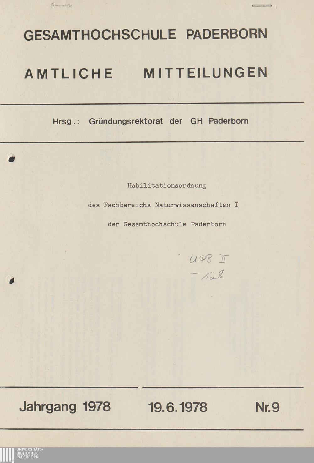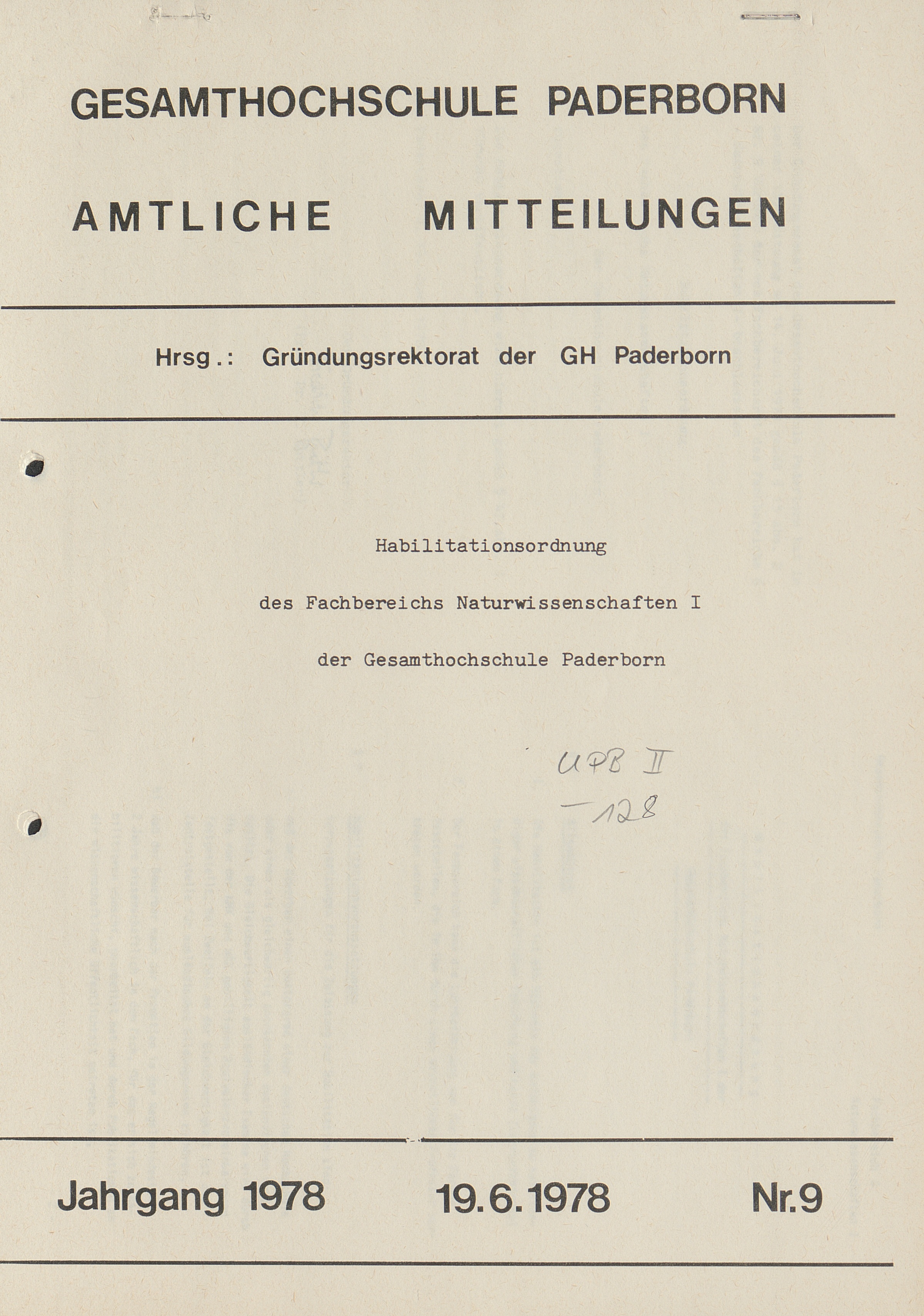 Nr. 9: Habilitationsordnung des Fachbereichs Naturwissenschaften I der Gesamthochschule Paderborn (19.6.1978)
