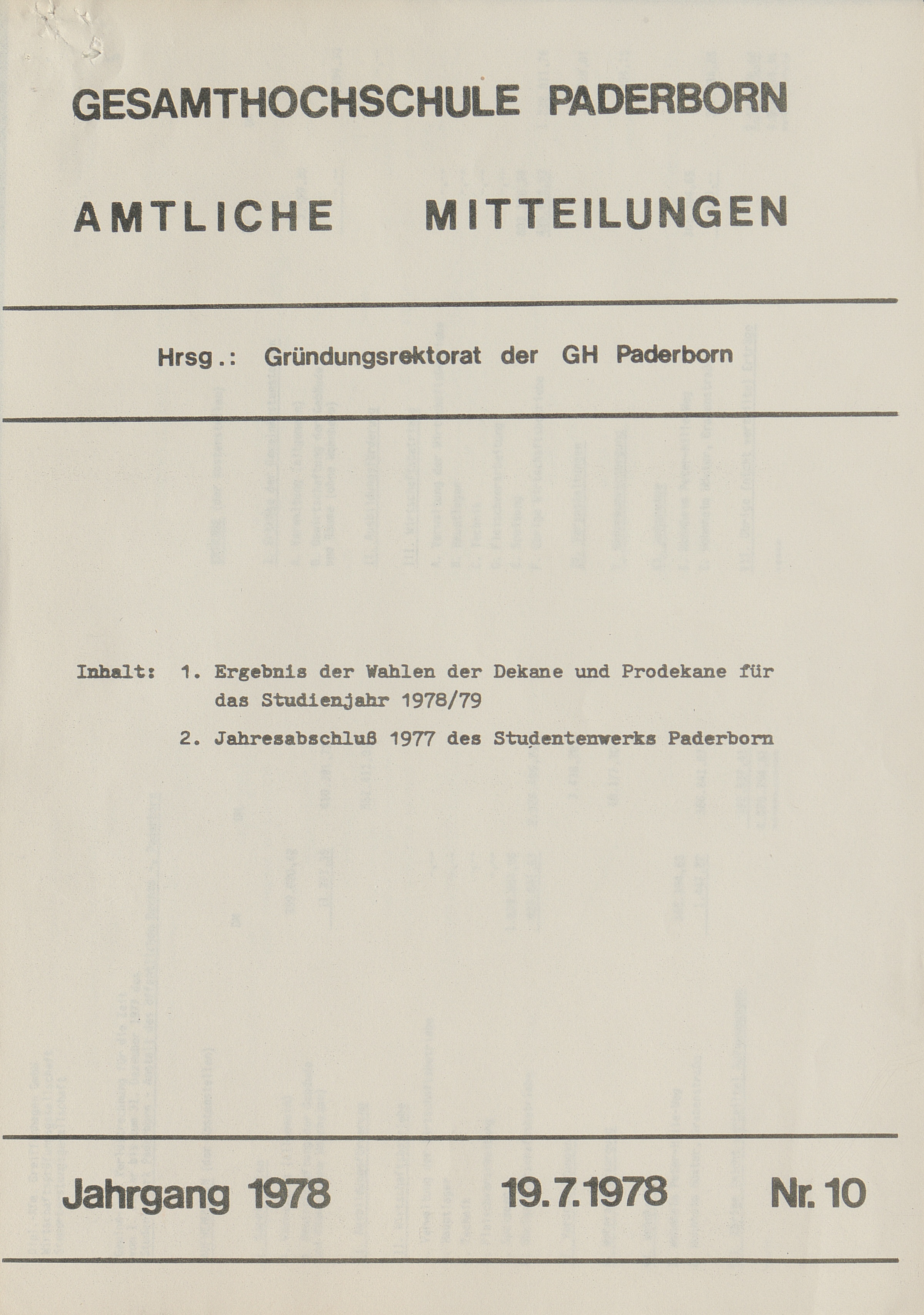 Nr. 10: 1. Ergebnis der Wahlen der Dekane und Prodekane für das Studienjahr 1978/78; 2. Jahresabschluß 1977 des Studentenwerks Paderborn (19.7.1978)
