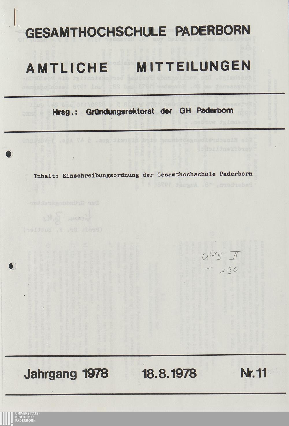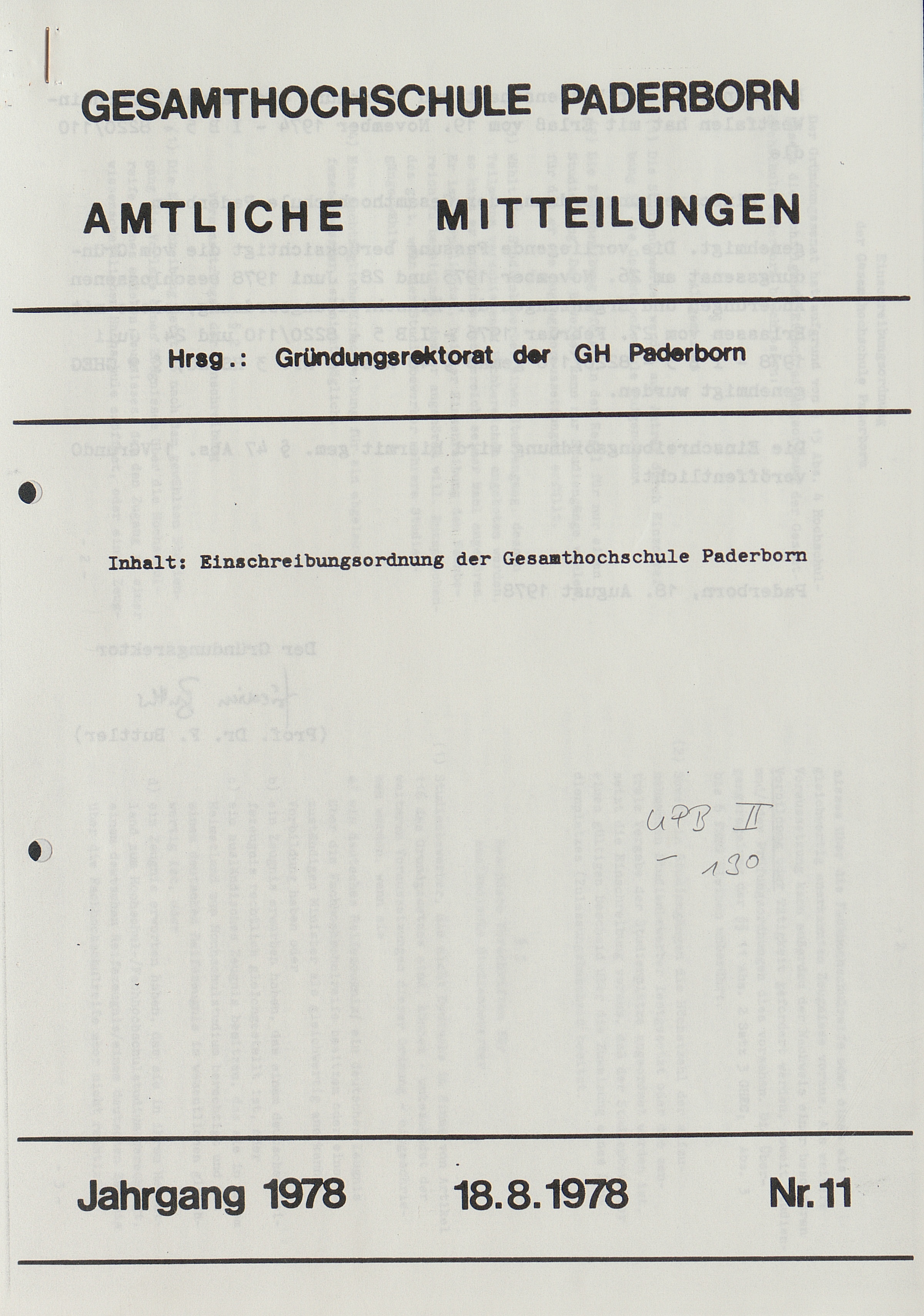 Nr. 11: Einschreibungsordnung der Gesamthochschule Paderborn (18.8.1978)