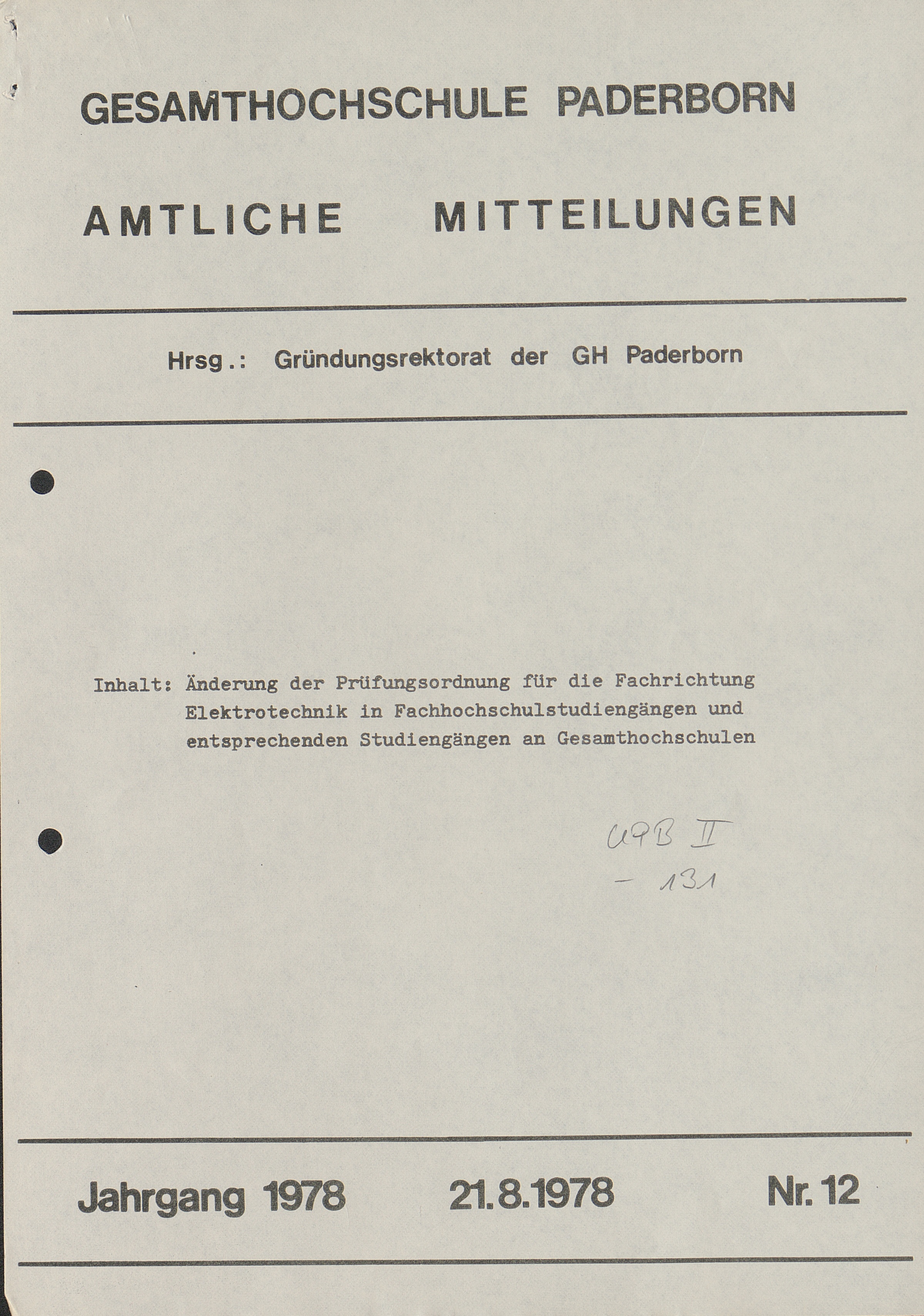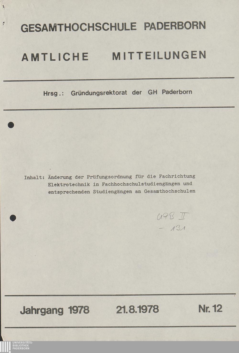 Nr. 7: Änderung der vorläufigen Prüfungsordnung für den integrierten Studiengang Elektrotechnik an der Gesamthochschule Paderborn (16.5.1978)