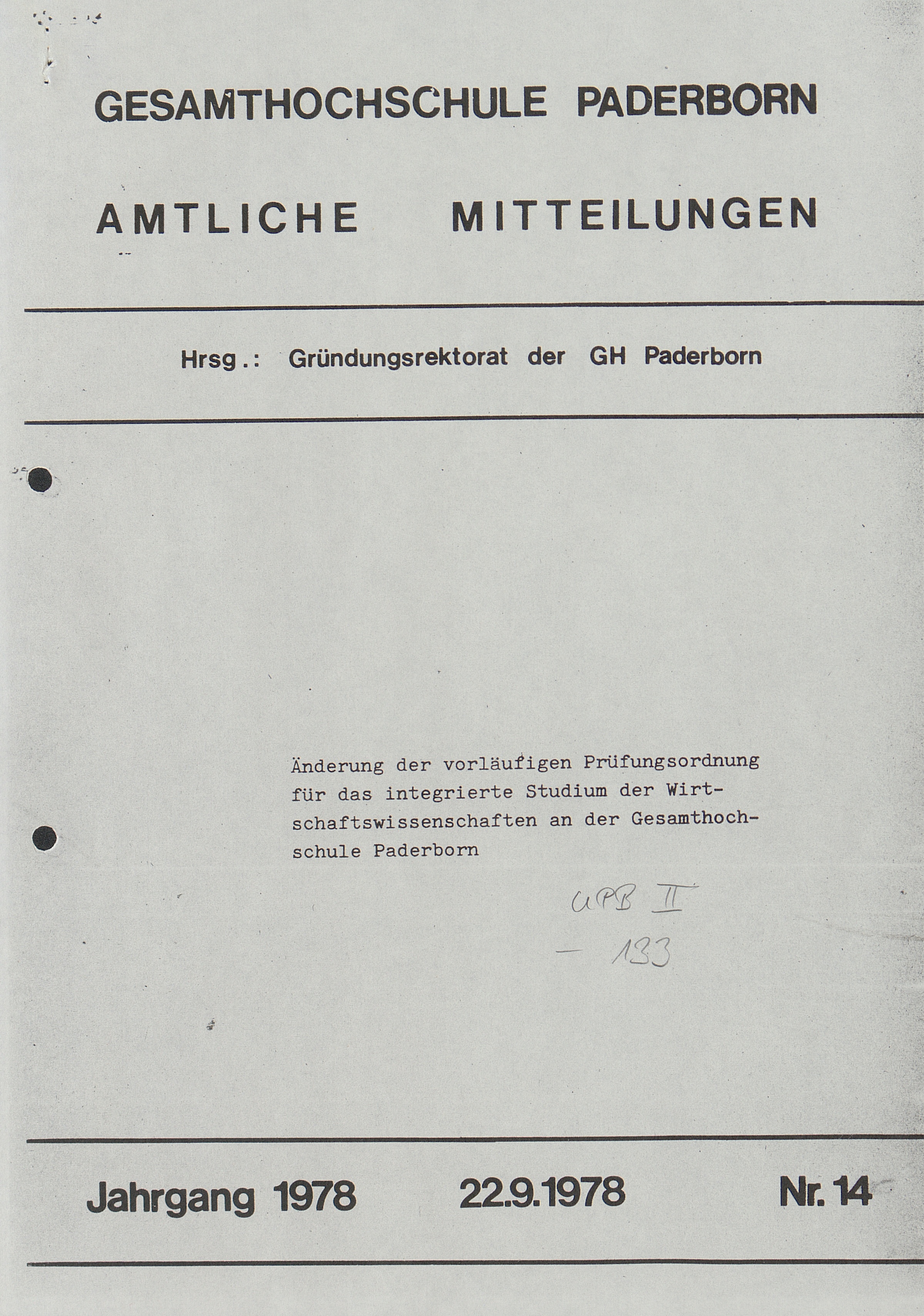 Nr. 14: Änderung der vorläufigen Prüfungsordnung für das integrierte Studium der Wirtschaftswissenschaften an der Gesamthochschule Paderborn (22.9.1978)