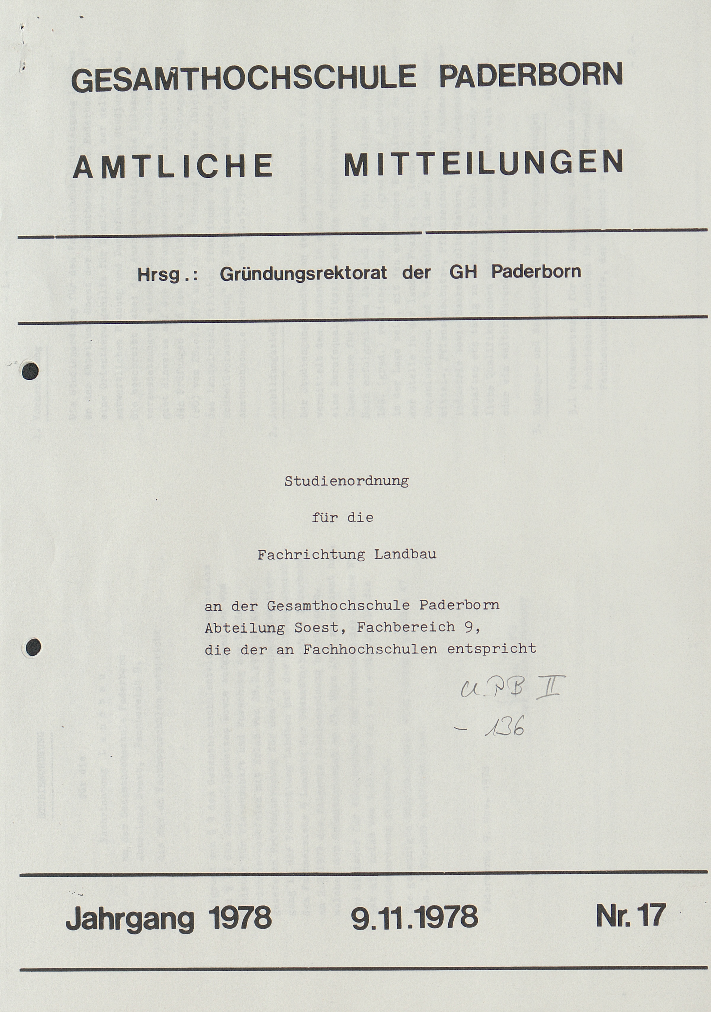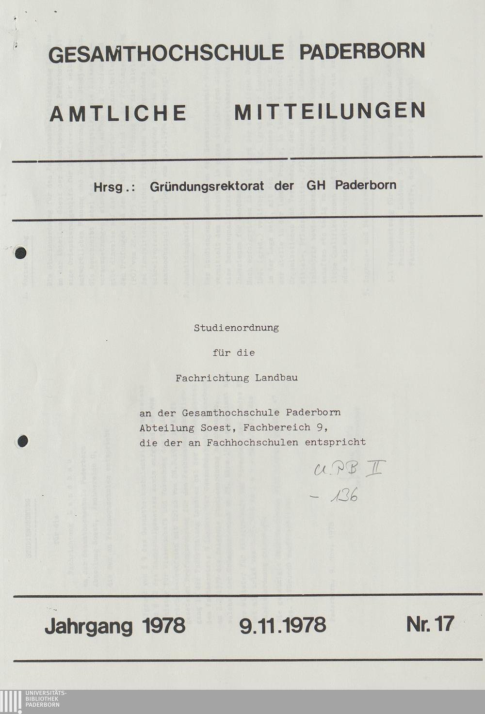 Nr. 17: Studienordnung für die Fachrichtung Landbau an der Gesamthochschule Paderborn Abteilung Soest, Fachbereich 9, die der an Fachhochschulen entspricht (9.11.1978)