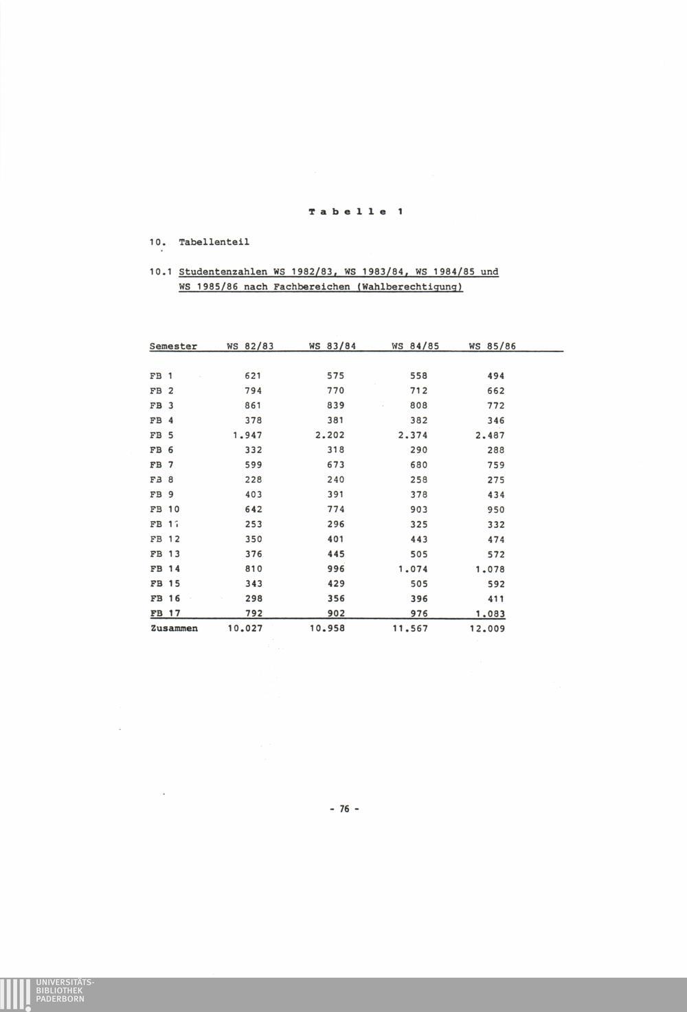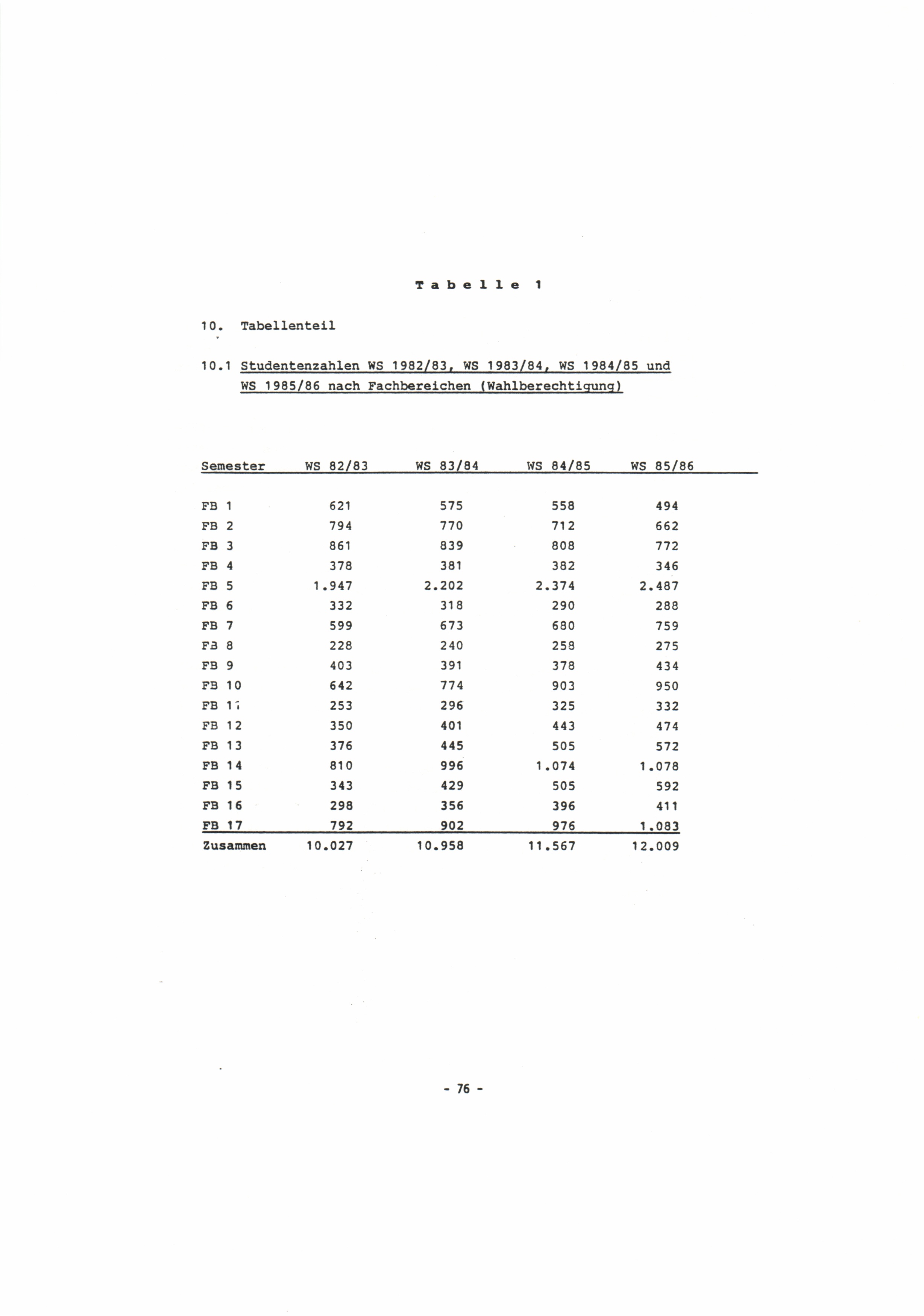 10.1 Studentenzahlen WS 1982/83, WS 1983/84, WS 1984/85 und WS 1985/86 nach Fachbereichen[...]