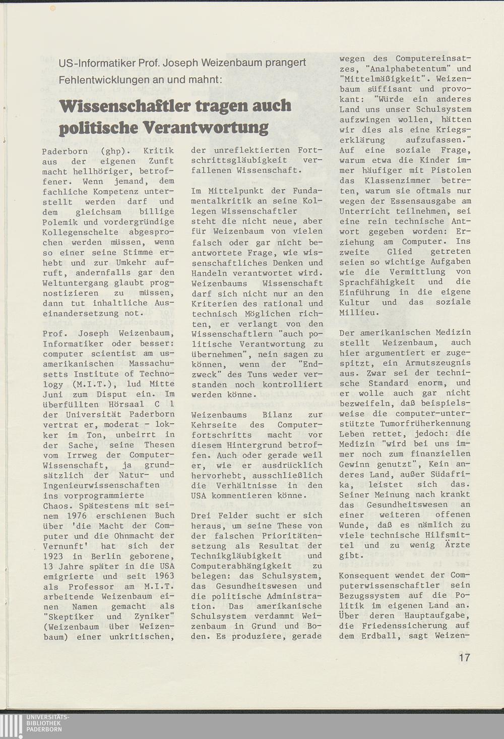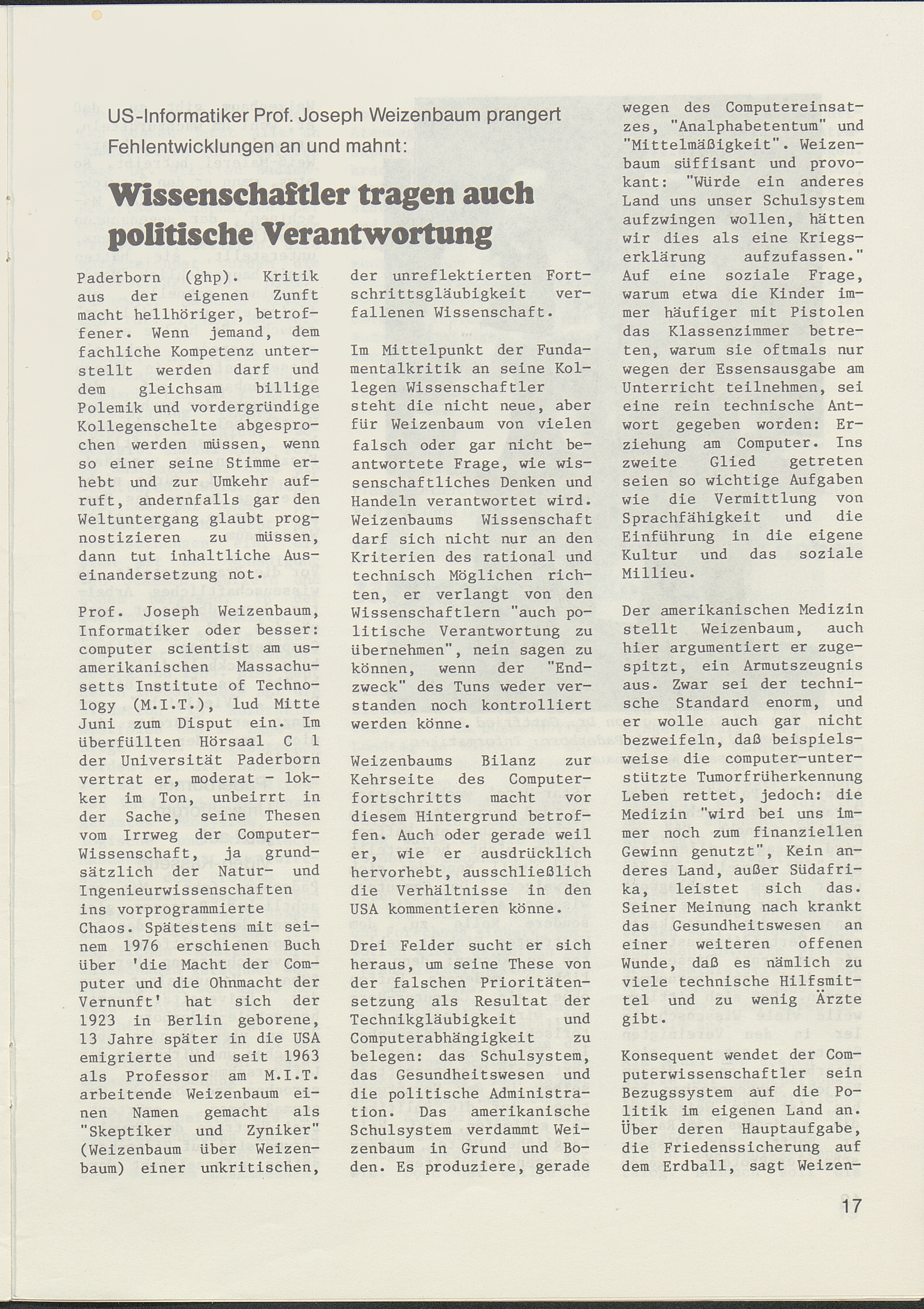 Prof. Weizenbaum: Verantwortung der Wissenschaftler