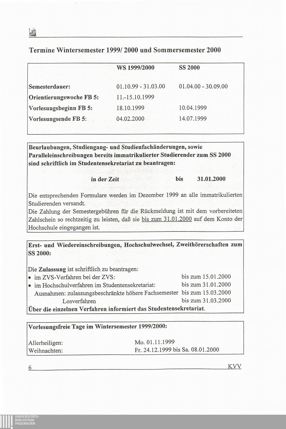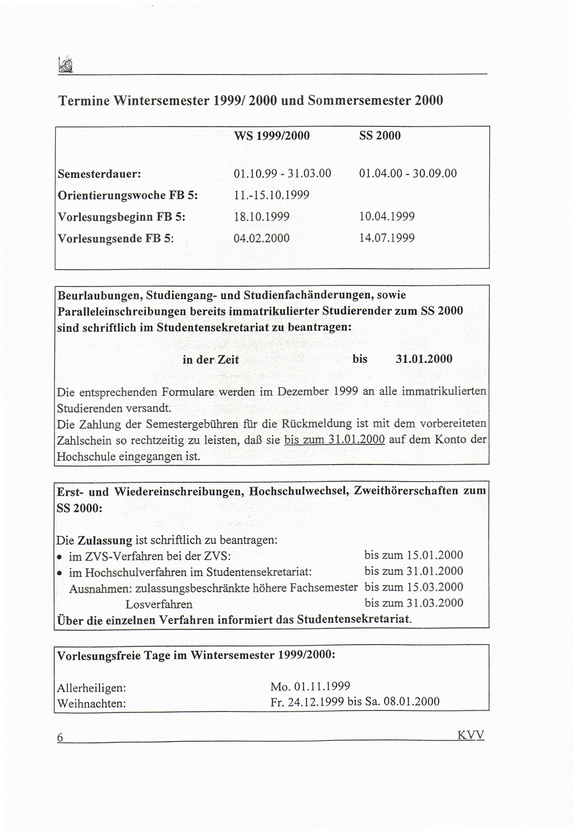 Termine Wintersemester 1999/2000 und Sommersemester 2000