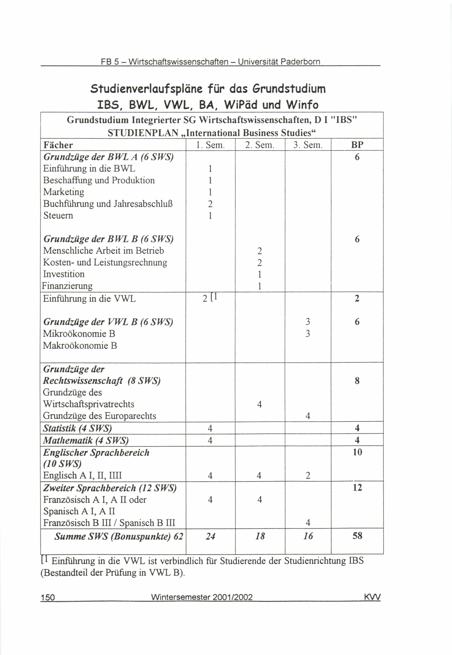 Studienverlaufspläne für das Grundstudium IBS, BWL, VWL, BA, WiPäd und Winfo